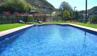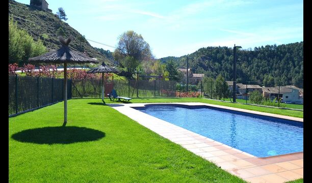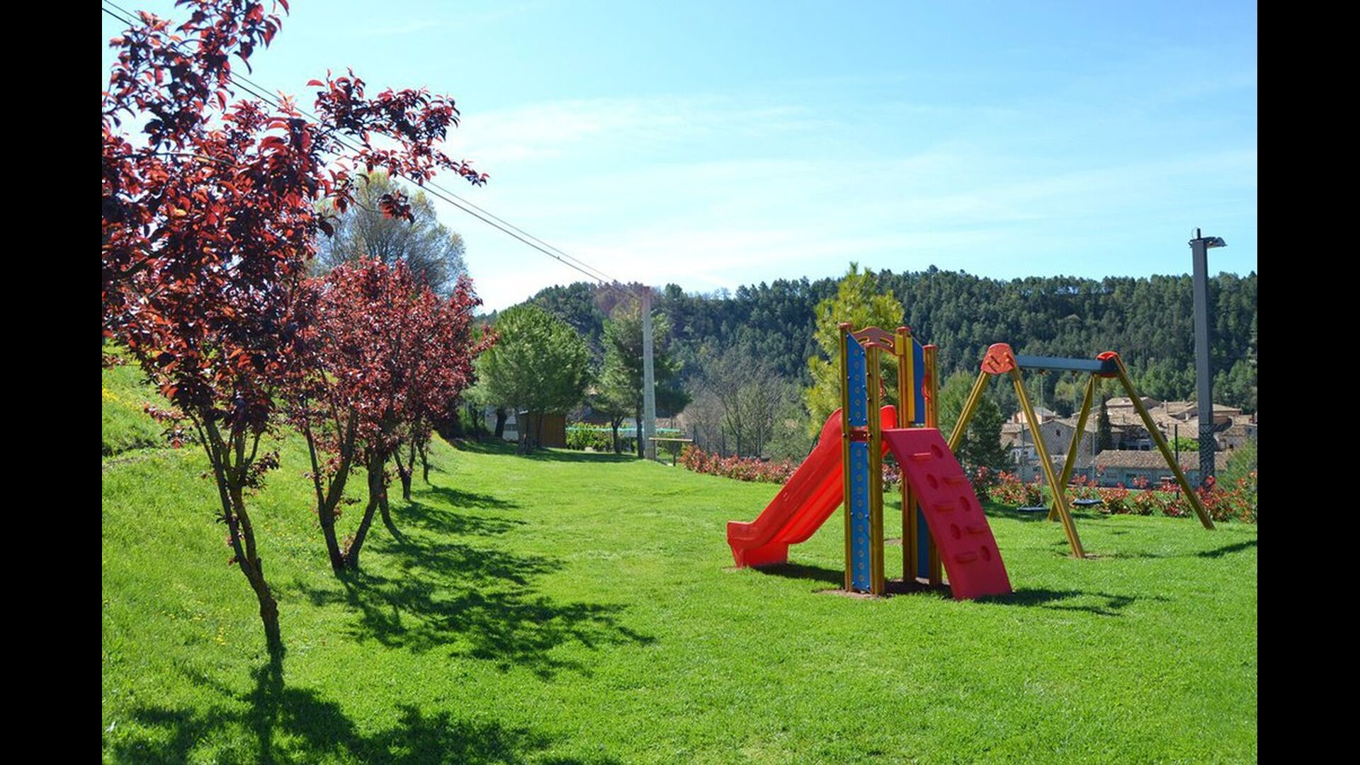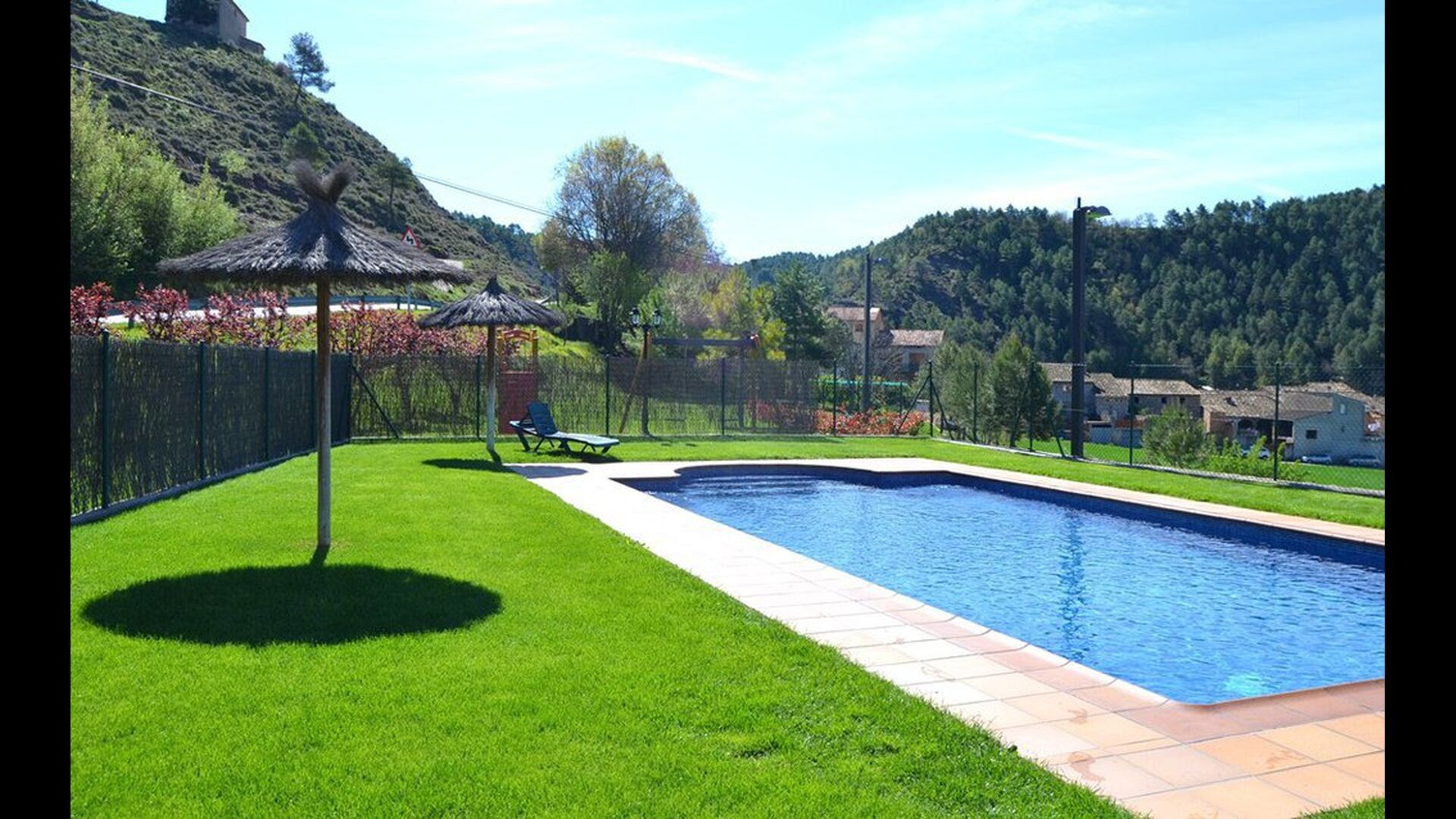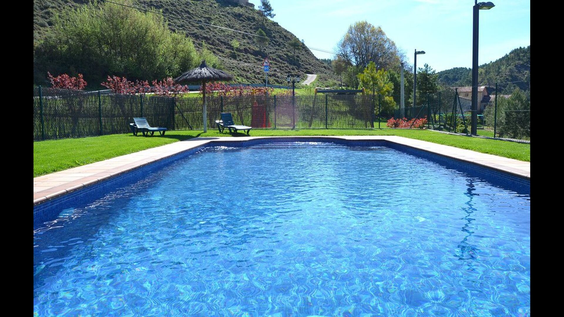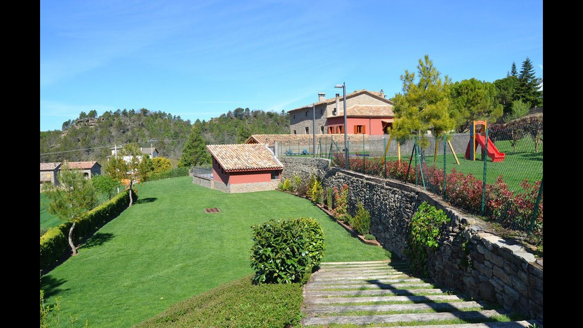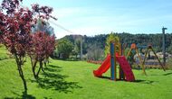 Plus loin dans le jardin, il y a une petite zone pour les enfants, où il y a une aire de jeux avec balançoires et un toboggan. Il dispose d'une piscine de 50 m2 (10 mx 5 m). Ici, il y a des escaliers qui descendent vers l’eau pour que les petits enfants puissent monter et descendre en toute sécurité. Les mesures d'eau de la piscine se trouvent à 75 cm à une extrémité et 2,1 m à l’autre. De la piscine, il y a aussi une vue magnifique.