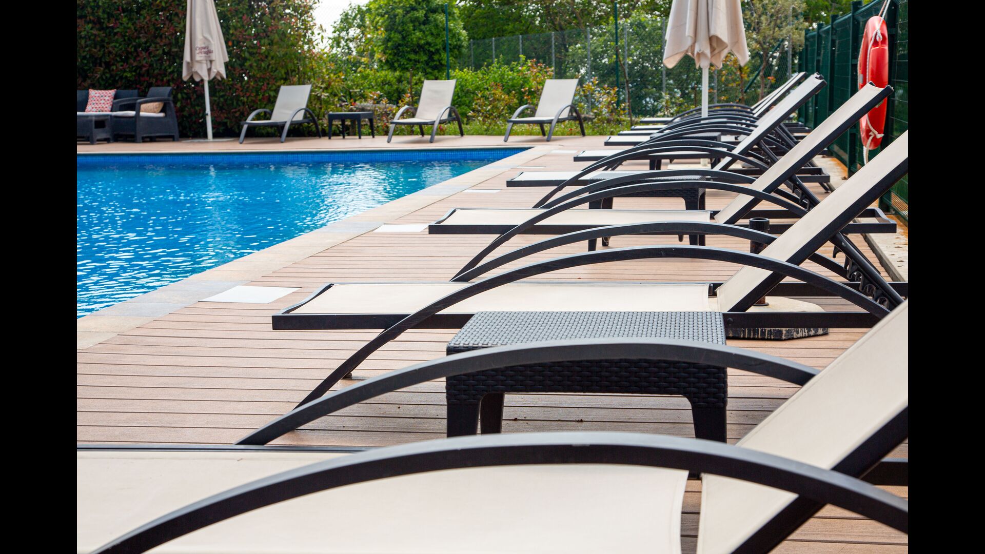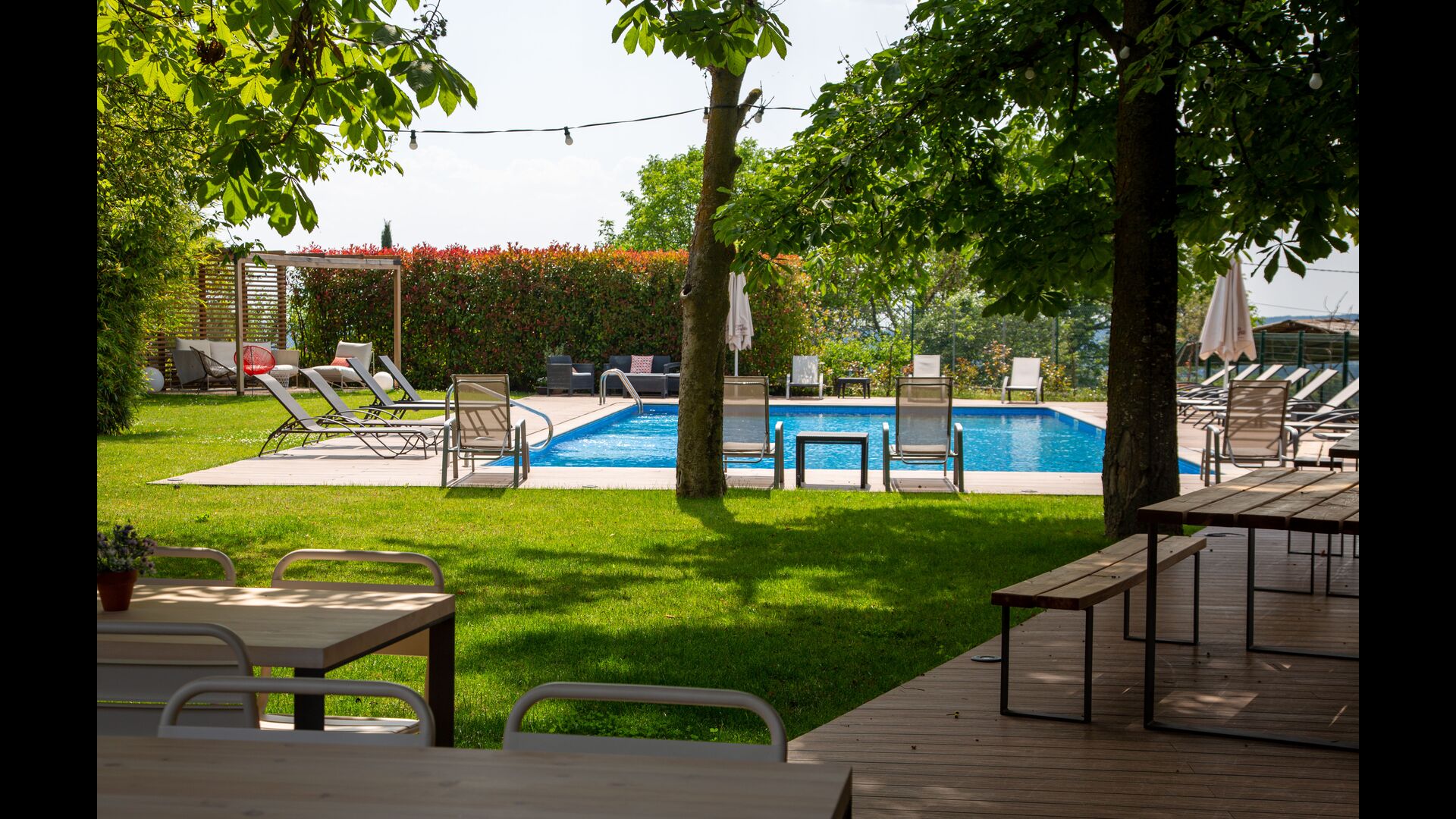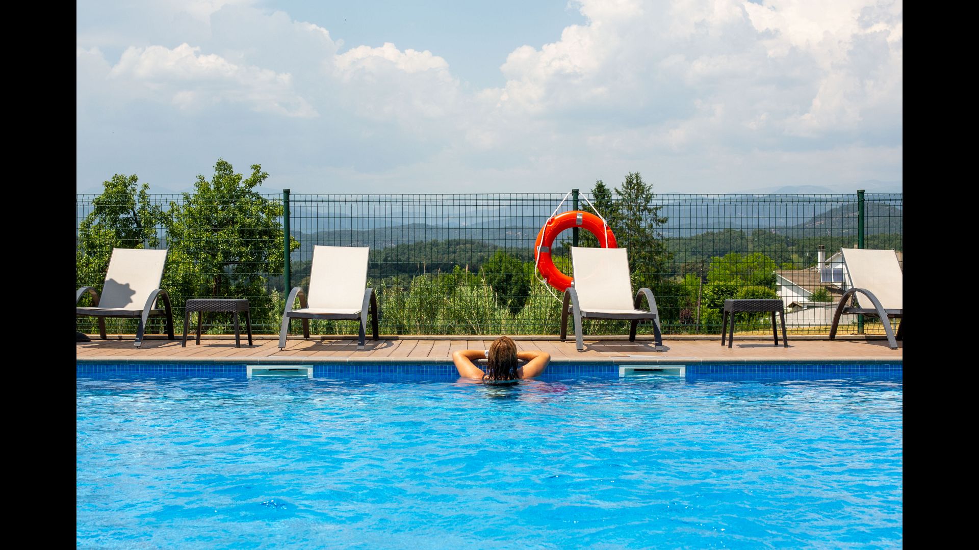 De plus, l'arrière de la maison a été transformé en un fantastique espace piscine avec la grande piscine (17 x 5 mètres), le café. tables, toilettes et vestiaires, et coins ombragés et endroits ensoleillés. La vue est imprenable, directement sur les Pyrénées.