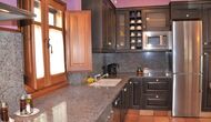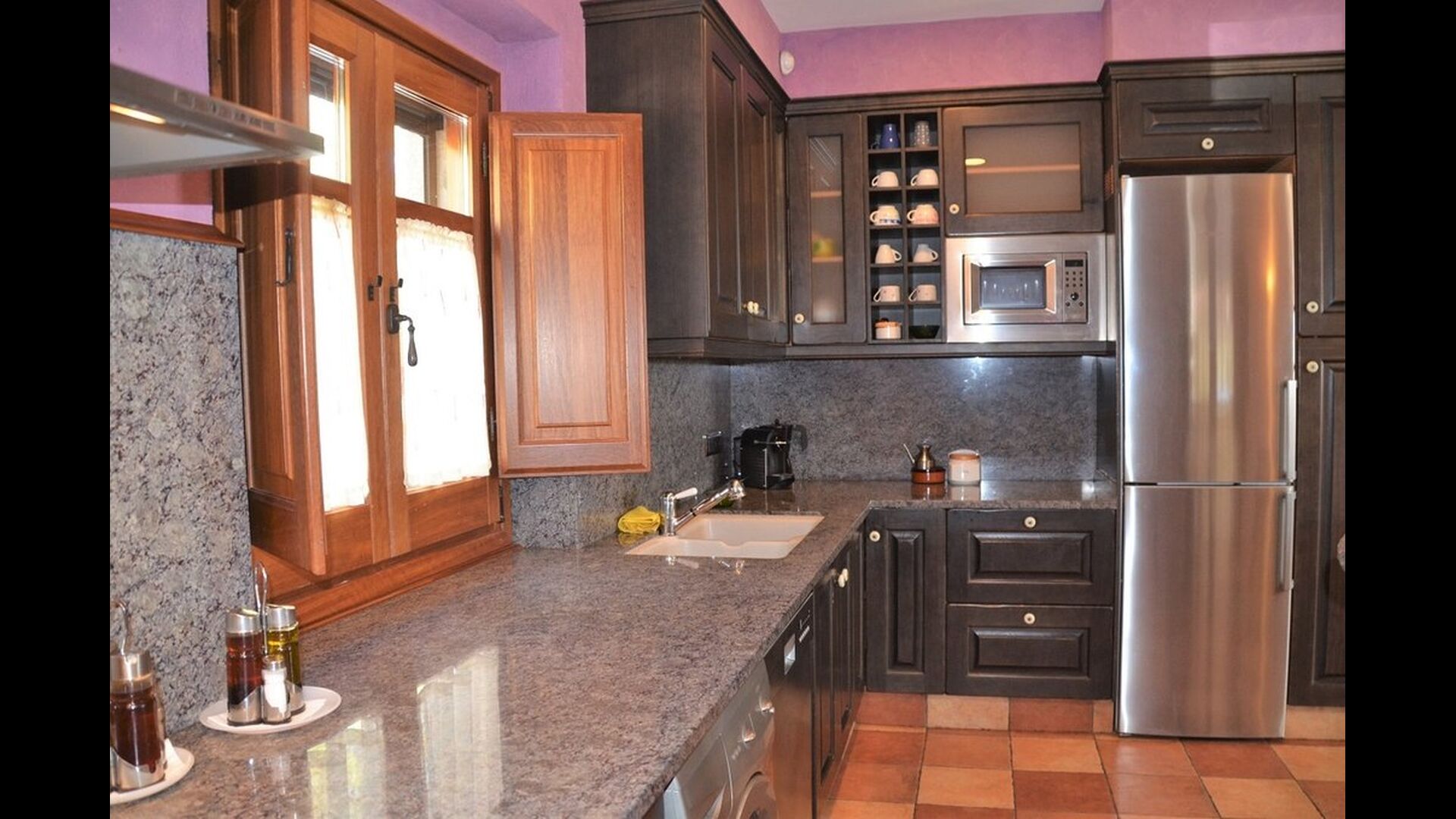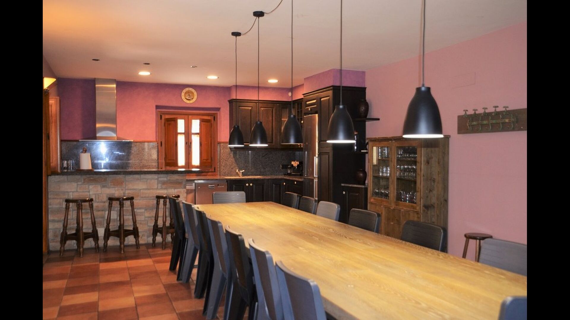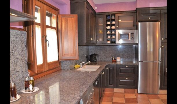 Au rez-de-chaussée se trouve une immense cuisine bien équipée avec un réfrigérateur, un congélateur, une cafetière, une cuisinière, deux lave-vaisselle, un four micro-ondes et d'autres ustensiles nécessaires. De plus, il y a un accès direct à la grande terrasse. Essayez de profiter du dîner à l'extérieur dans les chaudes soirées! Sinon, il y a une longue table à l'intérieur pouvant accueillir jusqu'à 22 personnes.