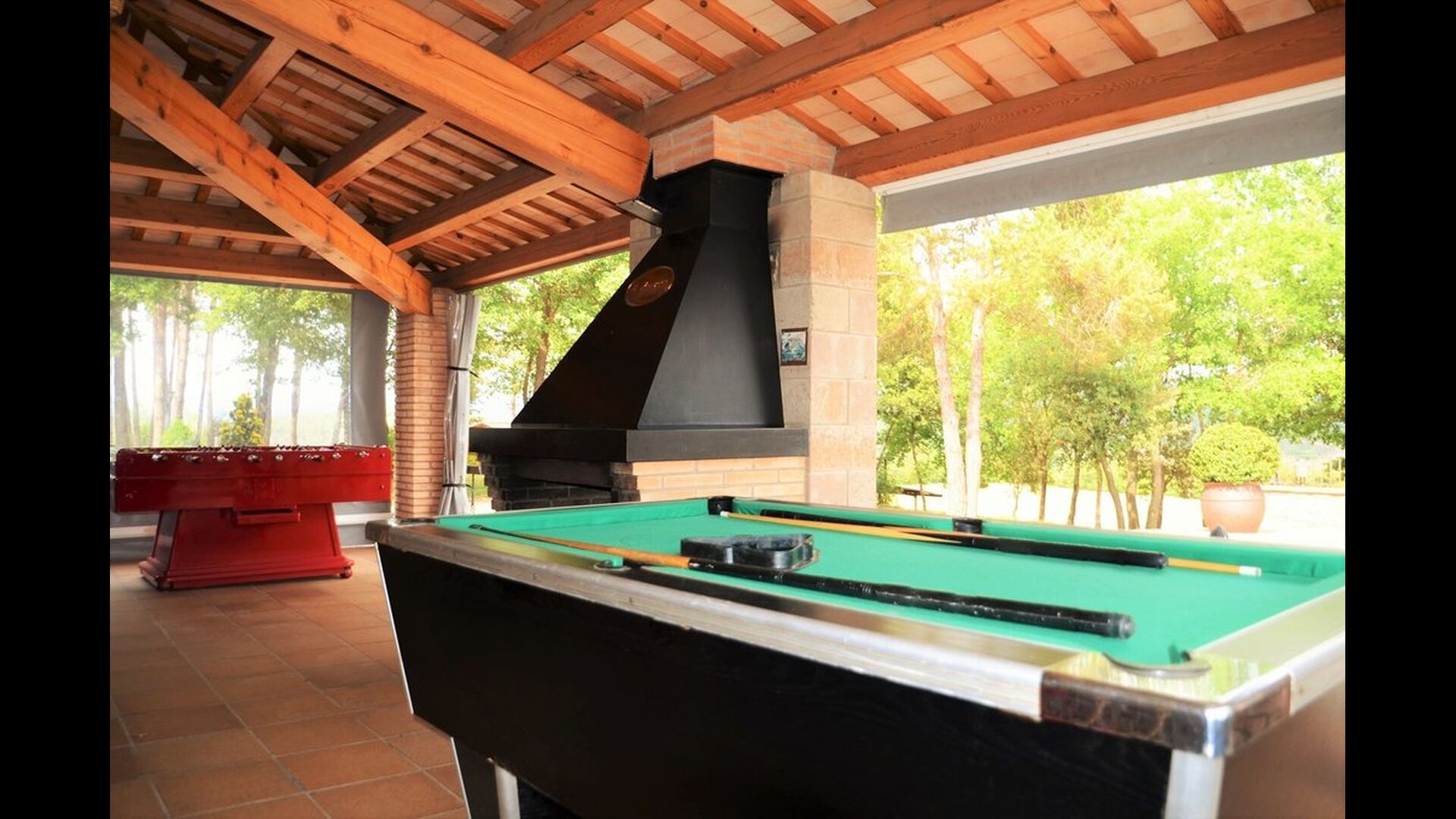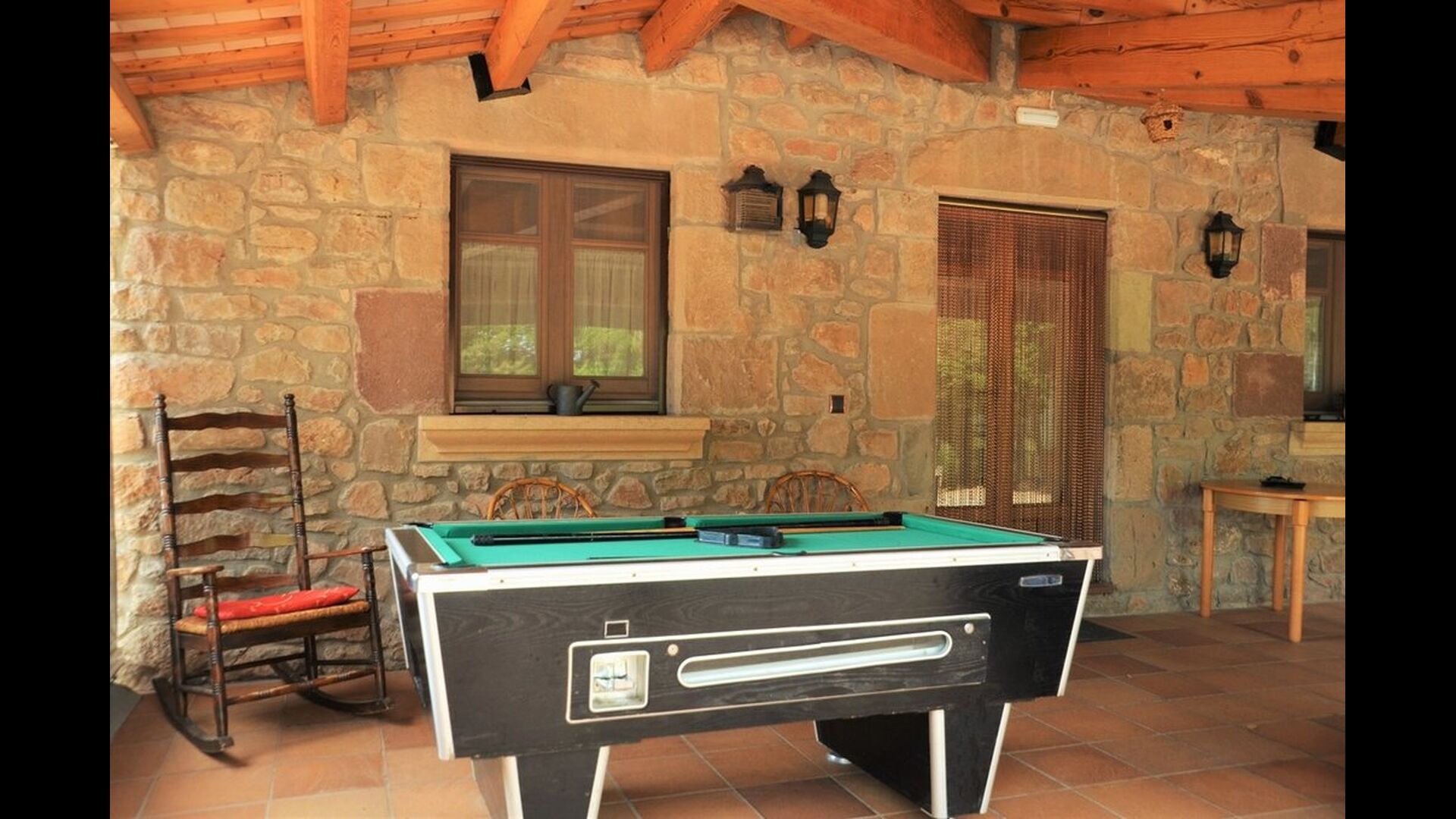 Il comprend un grand salon avec un coin canapé et une télévision à écran plat, un billard et un baby-foot. Il y a aussi une petite chambre avec des lits superposés et une salle de bain avec douche au rez-de-chaussée.