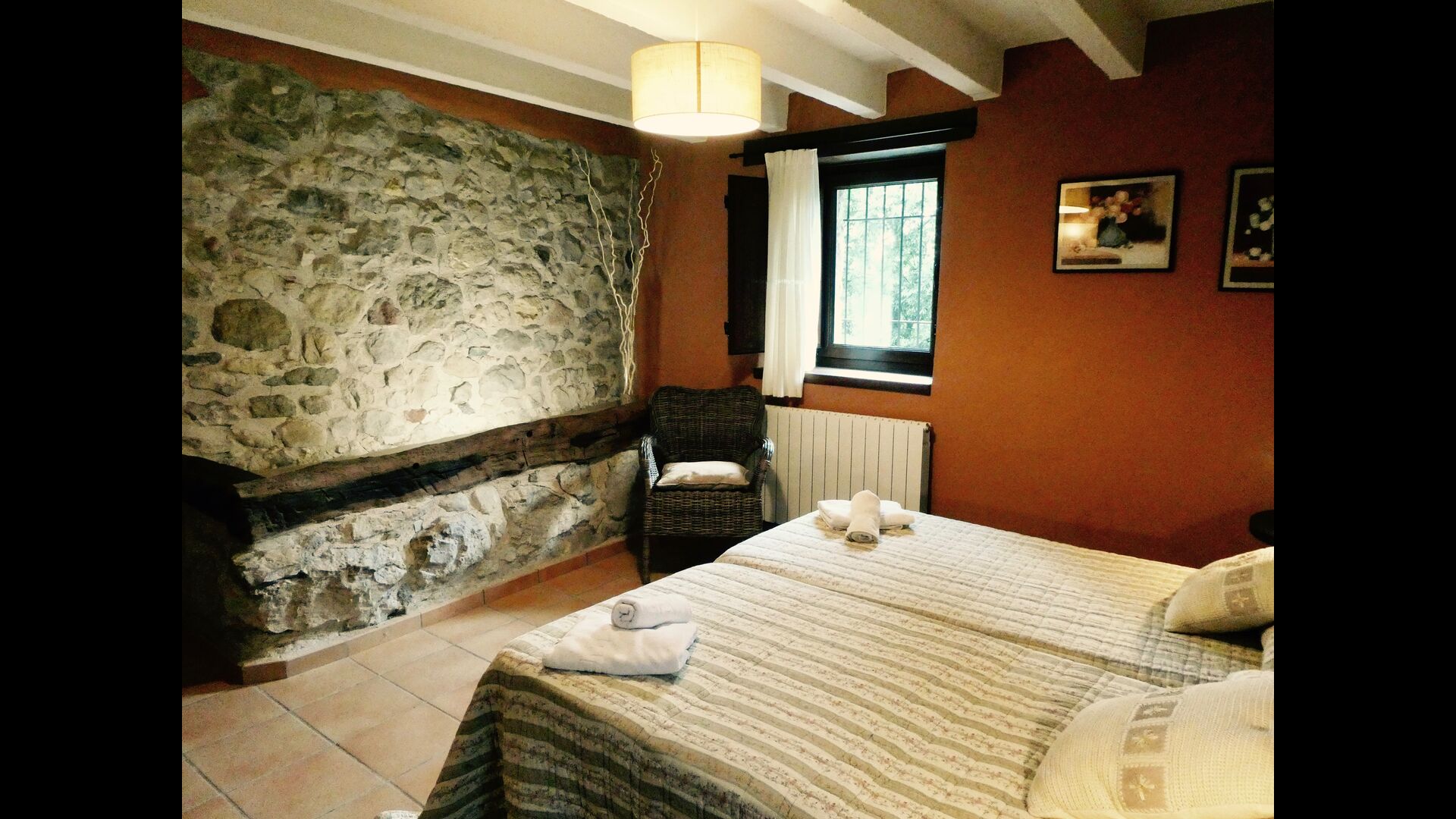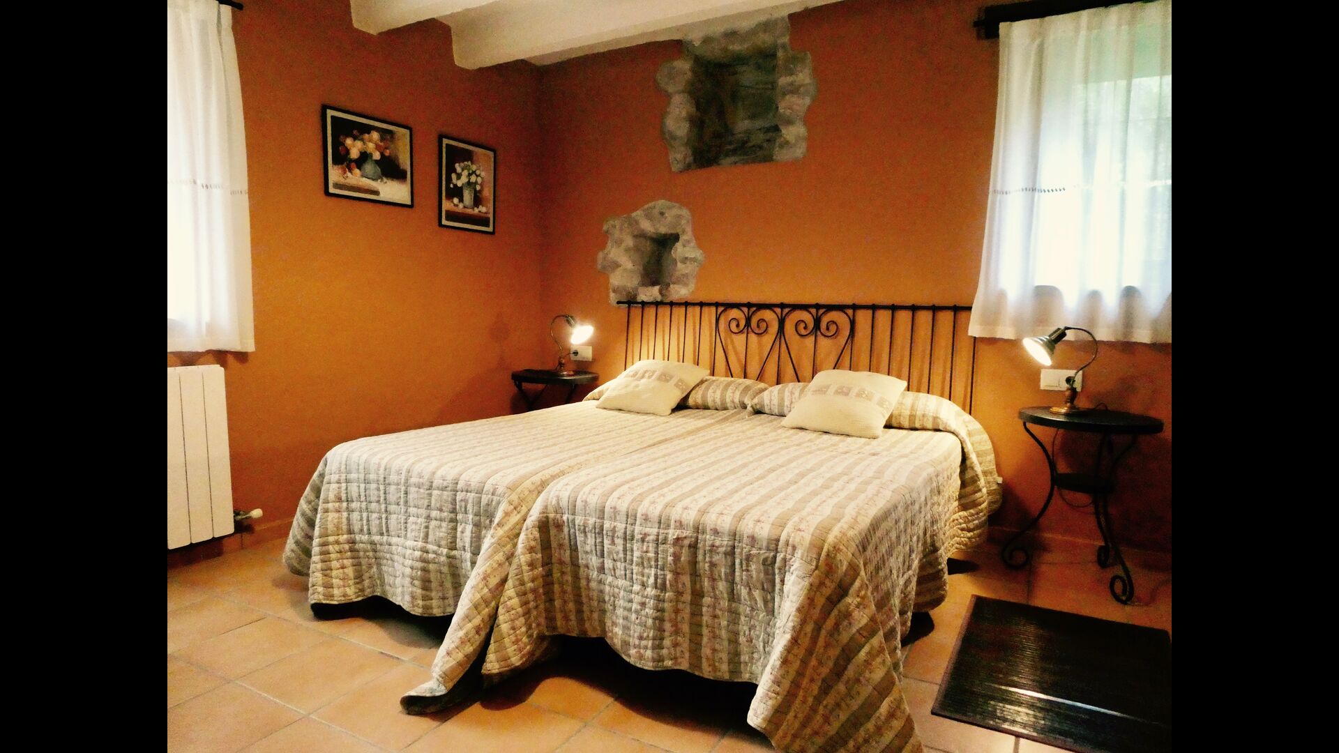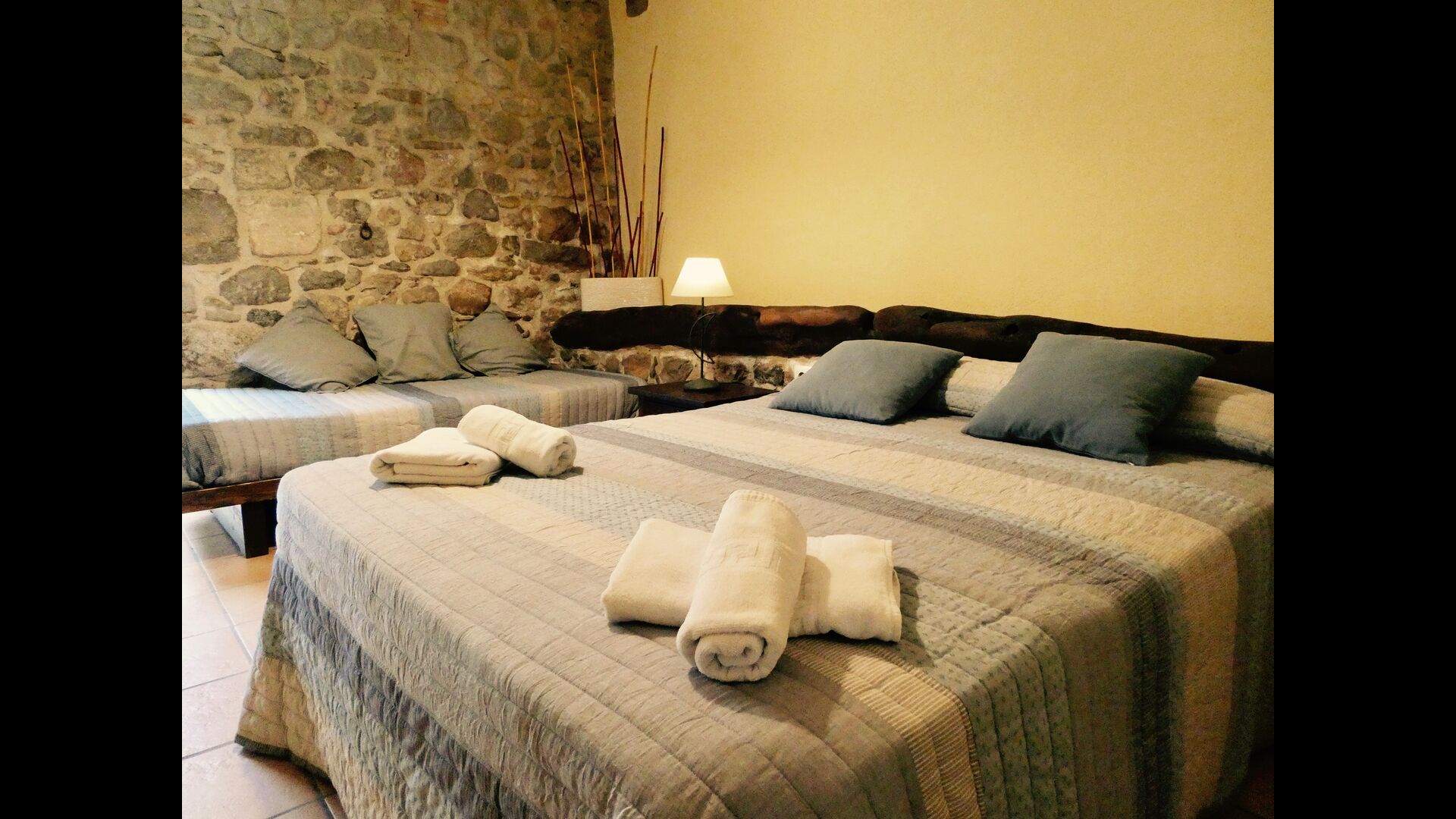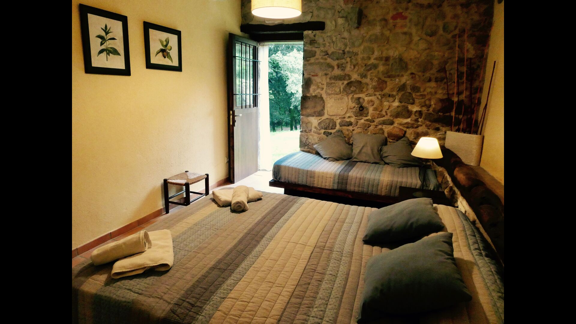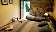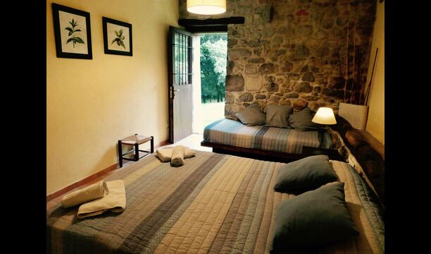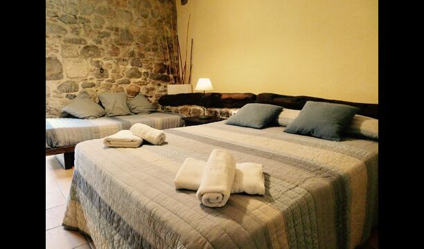 À Can Bosquita - Gran, il y a un total de 6 chambres, dont 2 chambres triples et 4 chambres doubles, ainsi que 4 salles de bains. La maison a un niveau d'entrée avec le parking. Comme la maison est située sur une pente, la maison a plusieurs niveaux, ce qui est très charmant. Quelques marches plus haut se trouvent les trois premières chambres, toutes très spacieuses. Elles sont équipées de lits simples, qui peuvent être aménagés en lits doubles si vous le souhaitez. L'une des chambres a sa propre sortie sur le jardin. Ces trois chambres se partagent deux salles de bains, toutes entièrement équipées et également avec douches. Plus haut, 3 chambres supplémentaires dont une plus petite que les autres en "style loft".