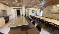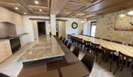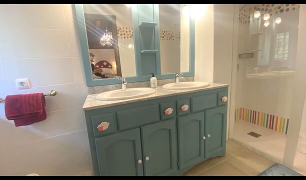 Au premier étage, il y a une très grande cuisine, qui est très bien équipée avec lave-vaisselle, plaque vitrocéramique, four, micro-ondes</strong >, un triple réfrigérateur et bien plus encore. Dans la même grande pièce, il y a une longue table à manger, pour que vous puissiez tous manger ensemble.