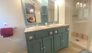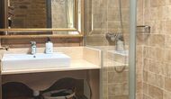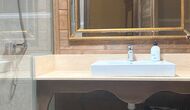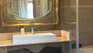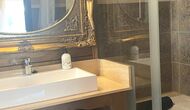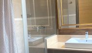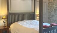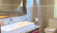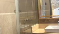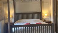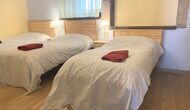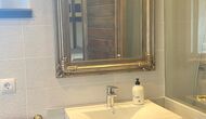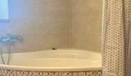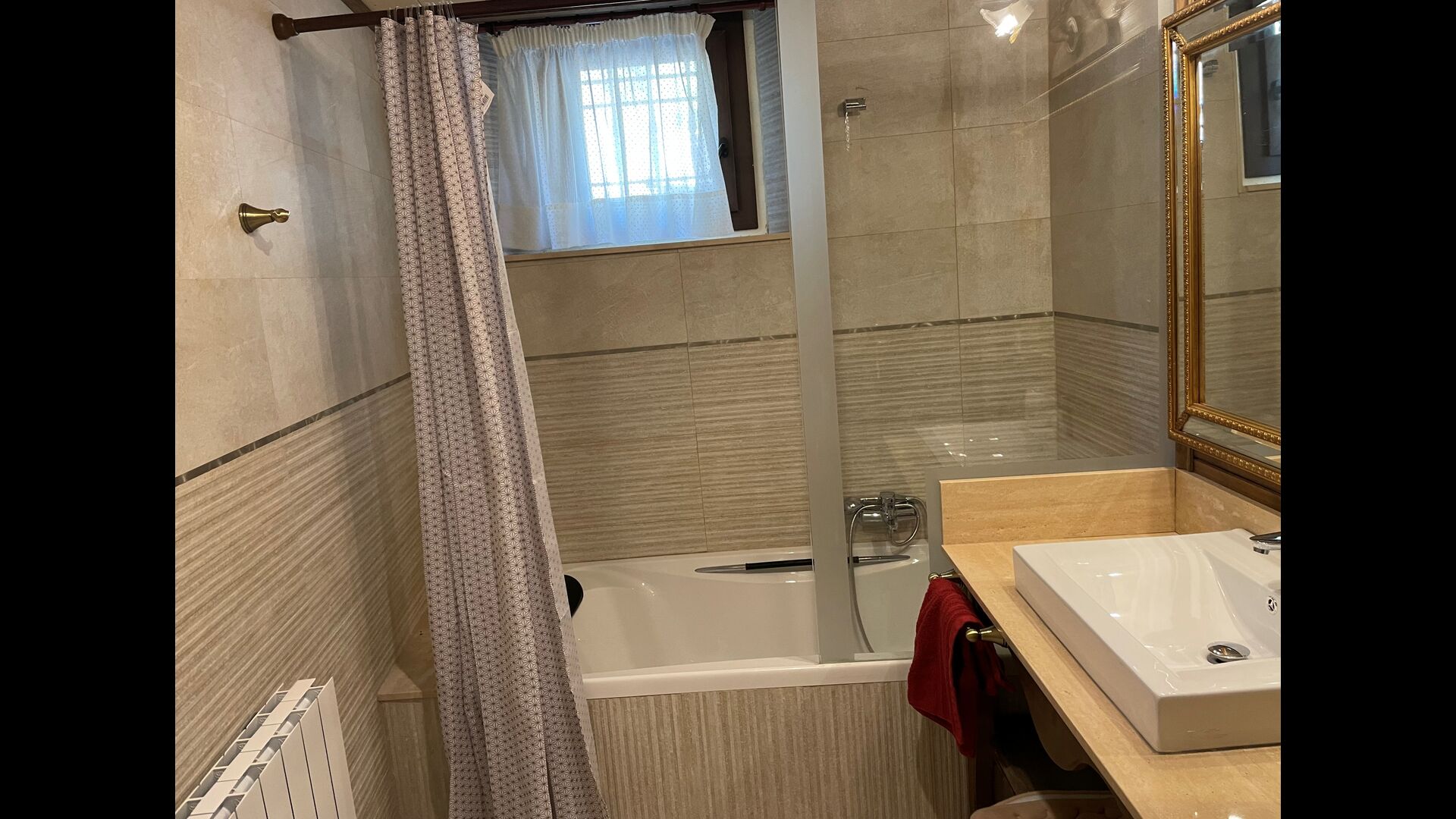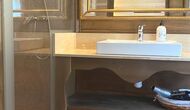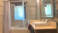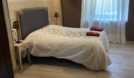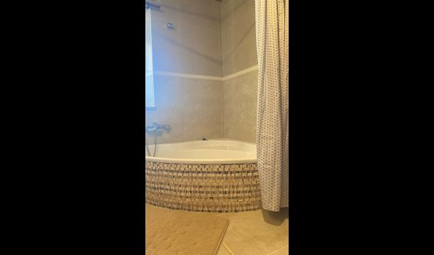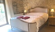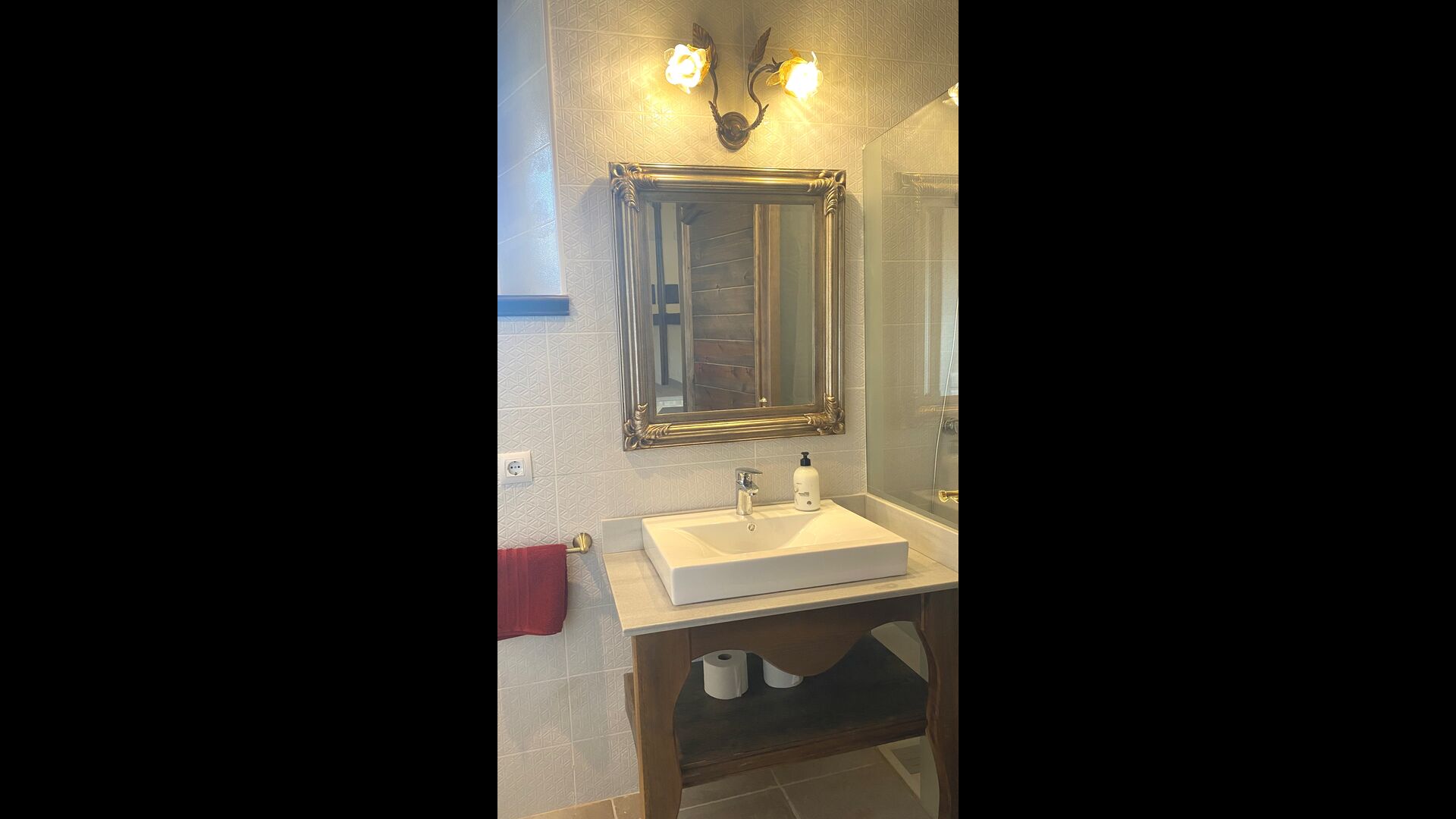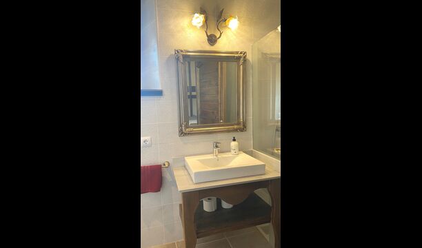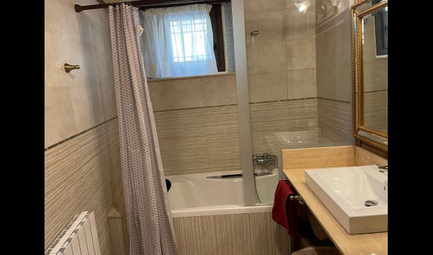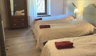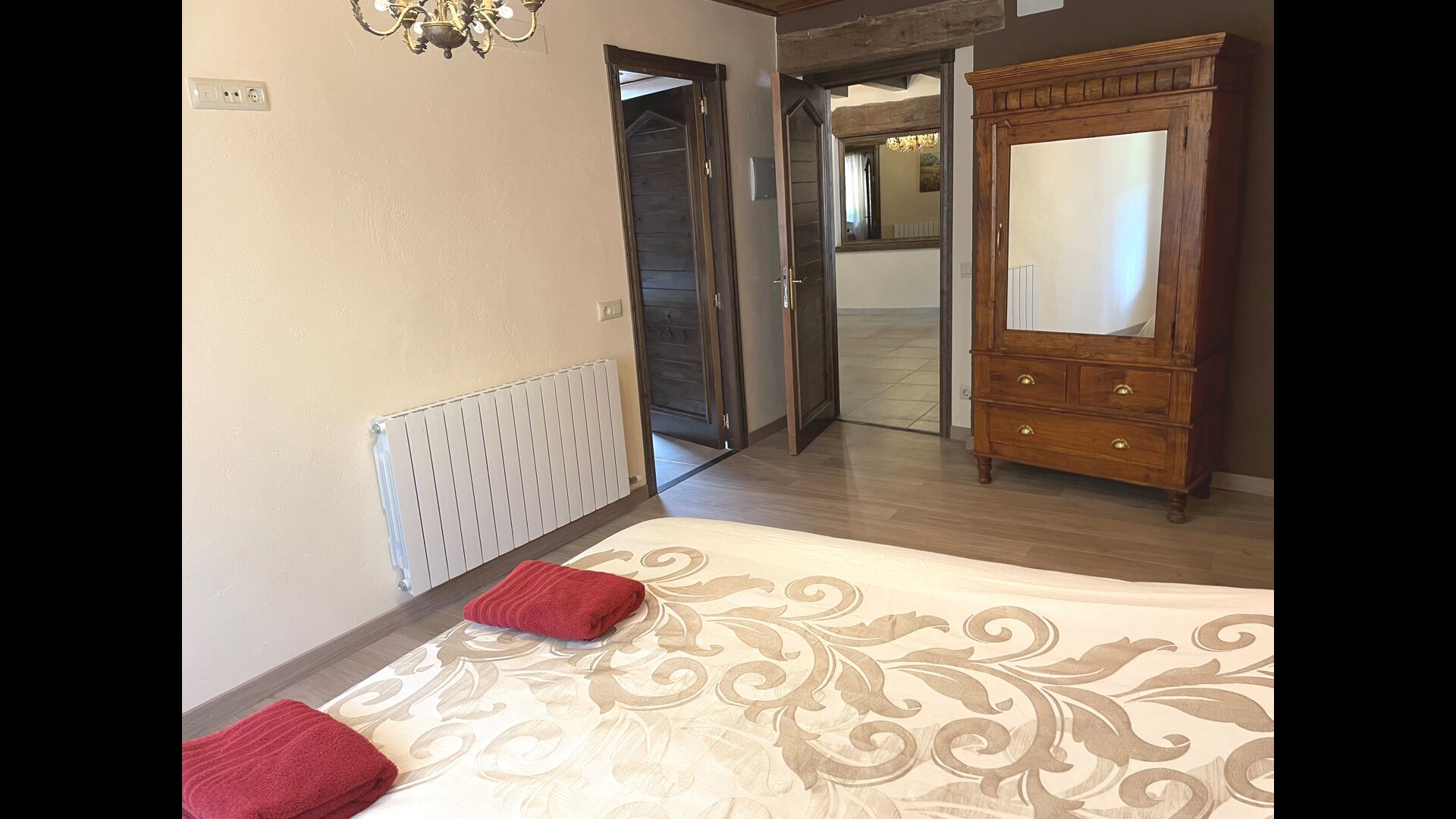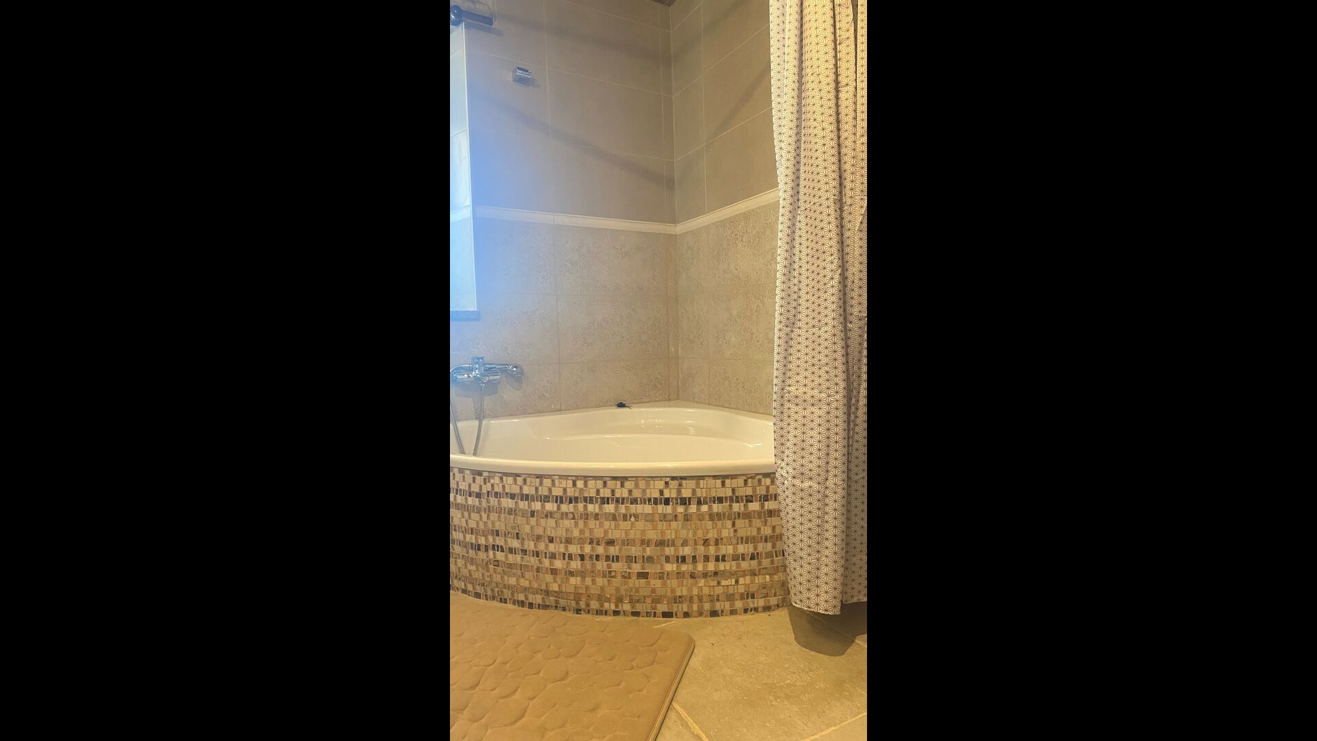 Dans le couloir de la cuisine, il y a une chambre double avec vue sur la piscine et une salle de bain avec baignoire. À l'autre extrémité, il y a une chambre avec un lit double et un lit simple (canapé). Cette chambre dispose d'un balcon avec vue sur la cour et d'une salle de bain avec baignoire.