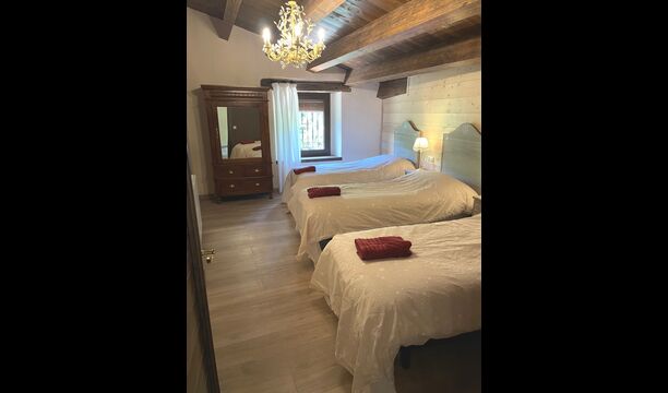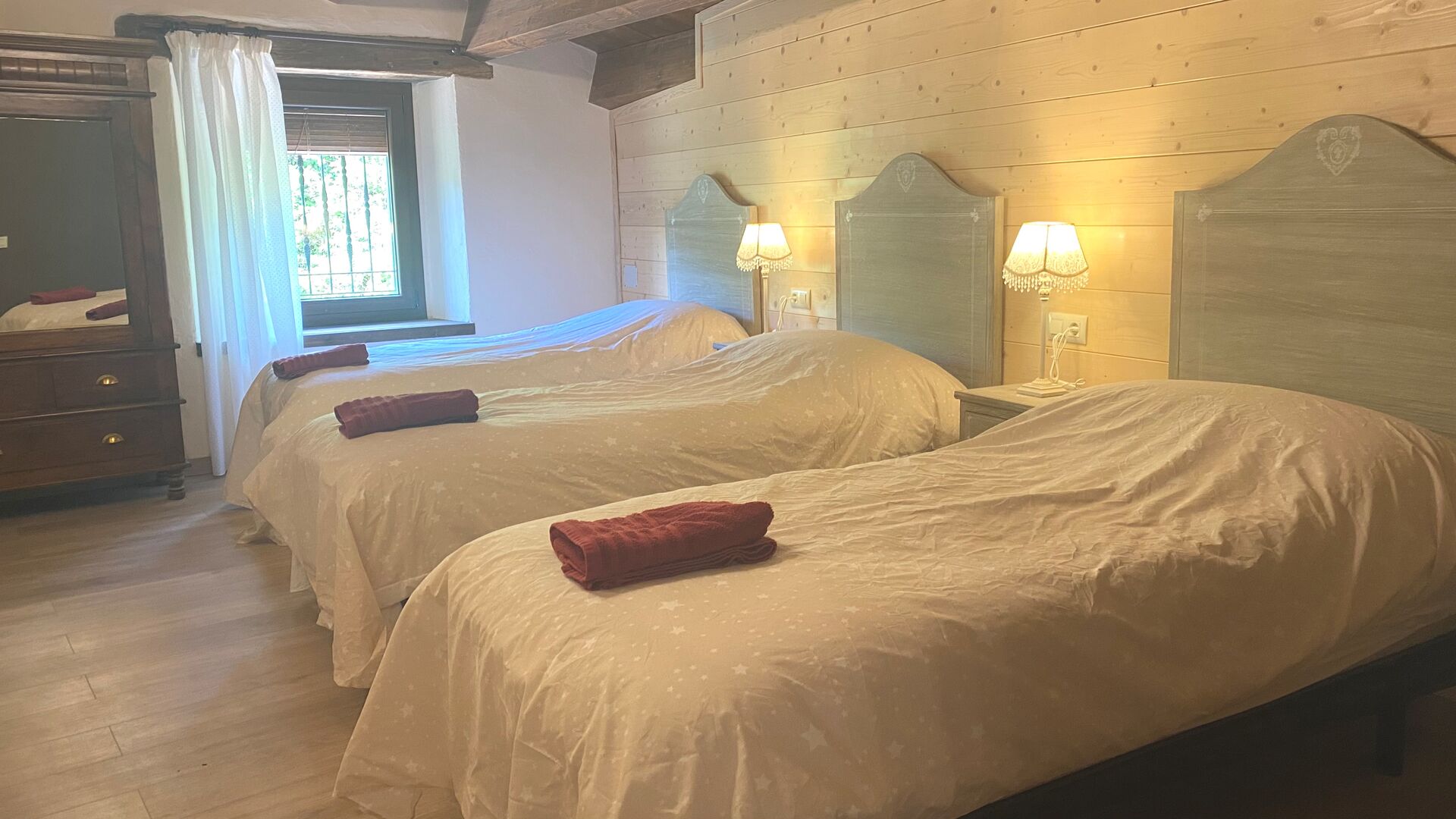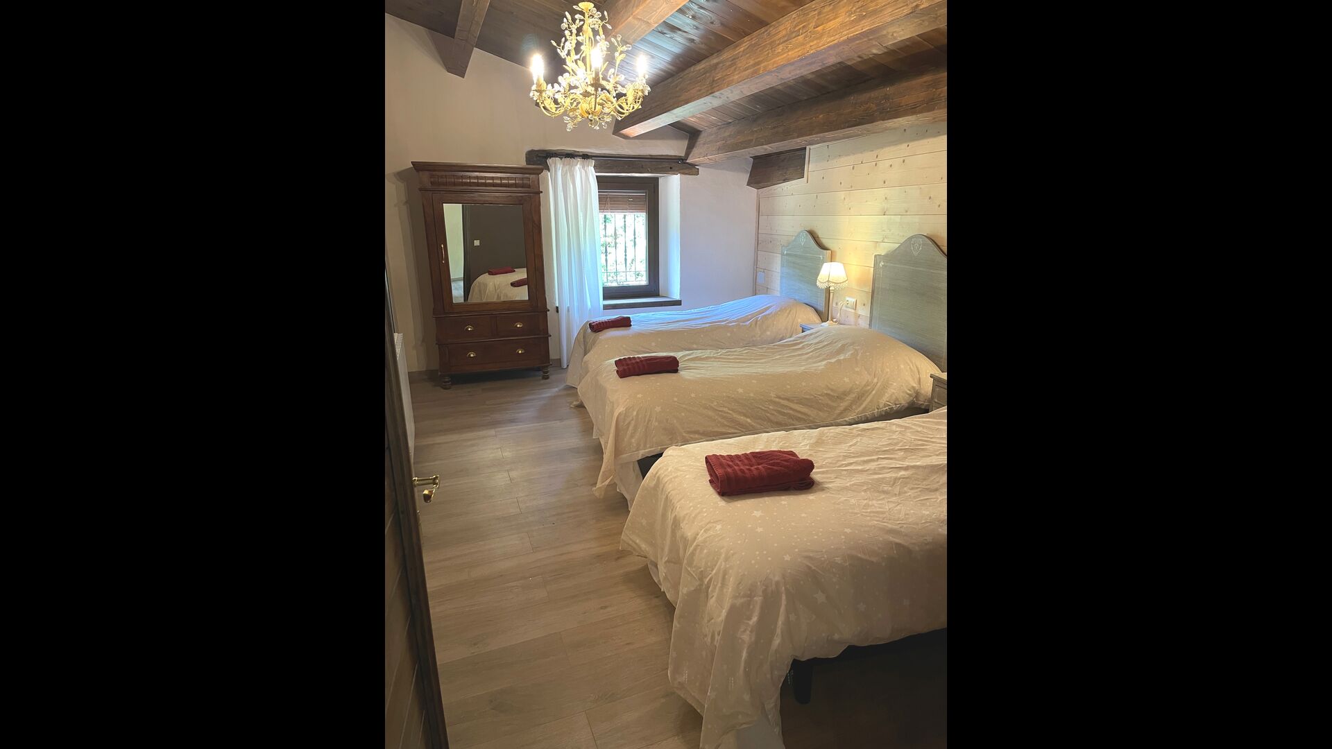 De plus, ici au premier étage, vous trouverez 2 chambres triples (3 lits simples) et 1 chambre double avec un lit double. Toutes ont une salle de bain attenante, deux avec douche et une avec baignoire. Enfin, dans l'espace commun, il y a un énorme canapé pouvant accueillir au moins 15 personnes et une télévision d'une taille correspondante.