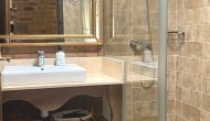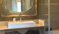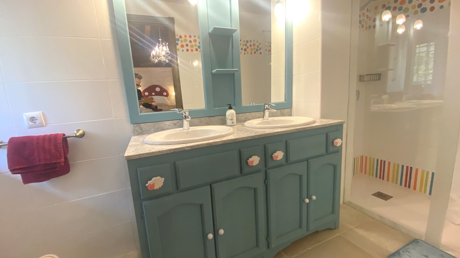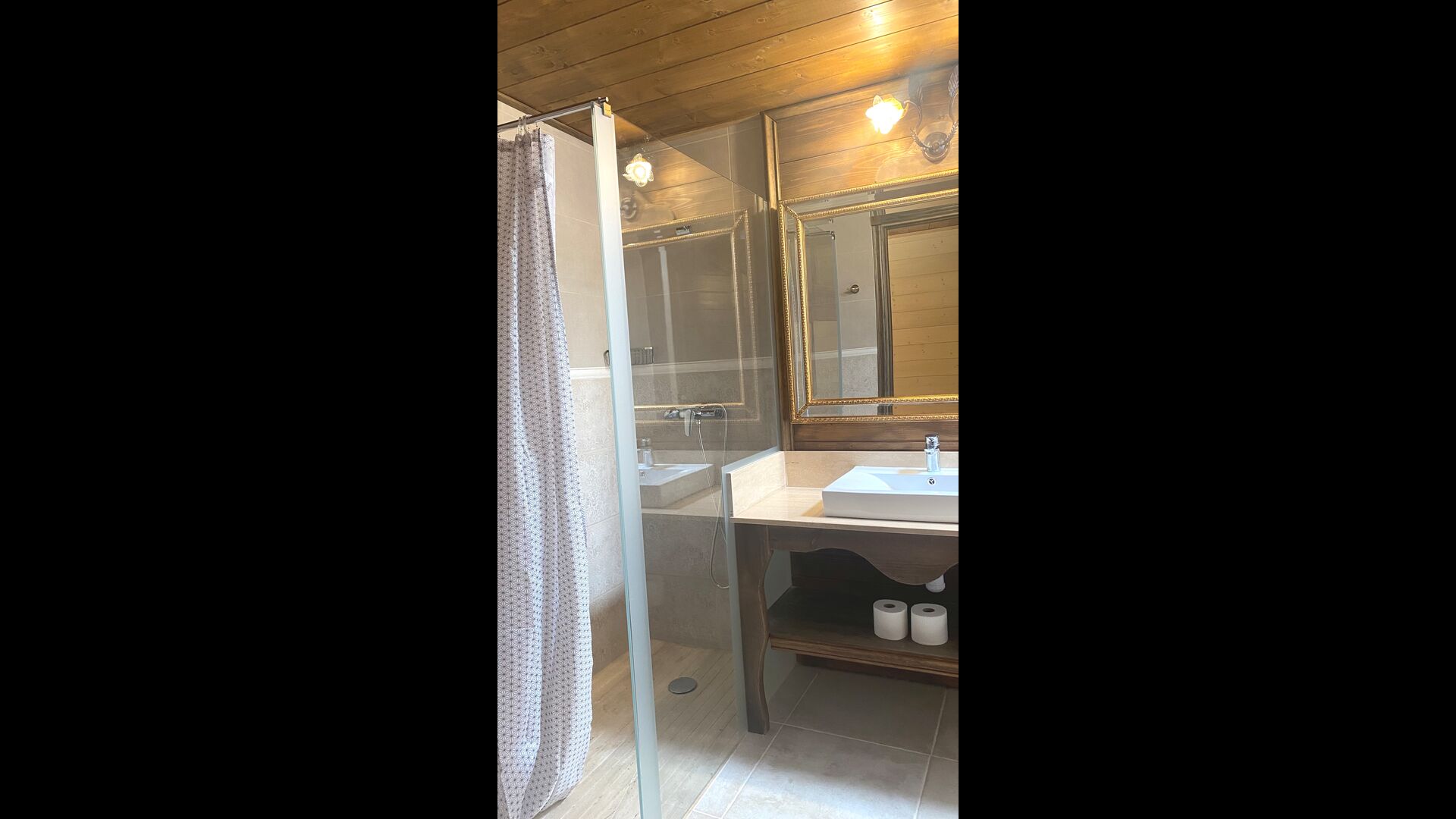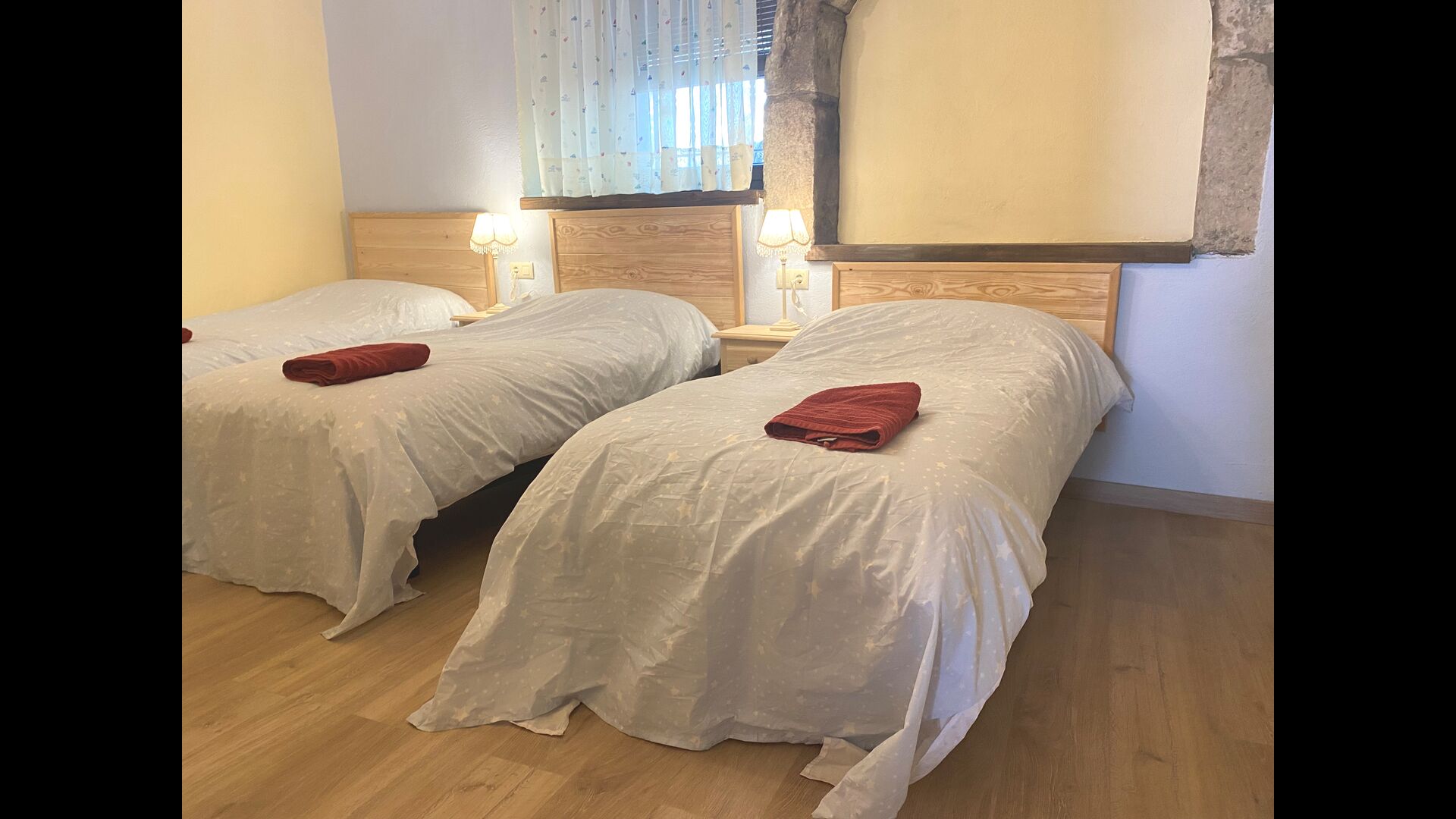 De plus, ici au premier étage, vous trouverez 2 chambres triples (3 lits simples) et 1 chambre double avec un lit double. Toutes ont une salle de bain attenante, deux avec douche et une avec baignoire. Enfin, dans l'espace commun, il y a un énorme canapé pouvant accueillir au moins 15 personnes et une télévision d'une taille correspondante.