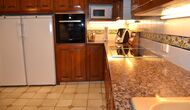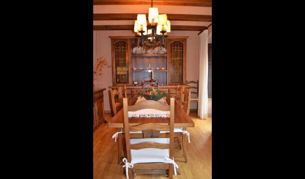 3 steps up, you enter the “ground floor” of the house with kitchen, sitting area with TV and a completely new bathroom with shower. The kitchen is very well equipped with much more kitchenware than one usually find in a holiday home, as well as fridge, freezer, microwave, oven, ceramic hotplates, dishwasher, toaster, coffee maker and food processor. Furthemore, there is a spacious dining room with dining table and French balconies.