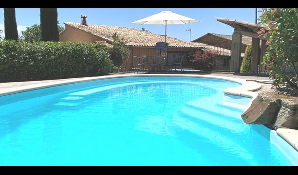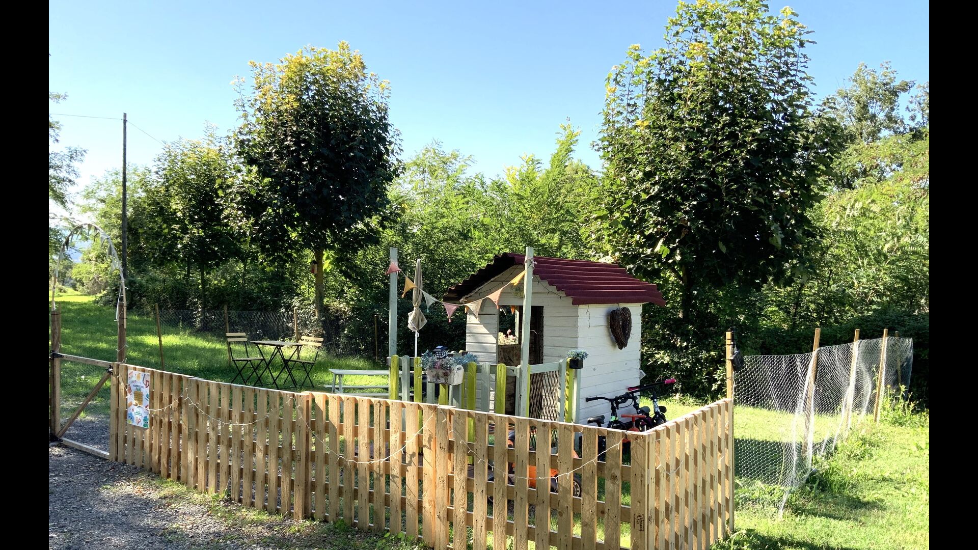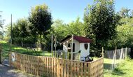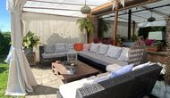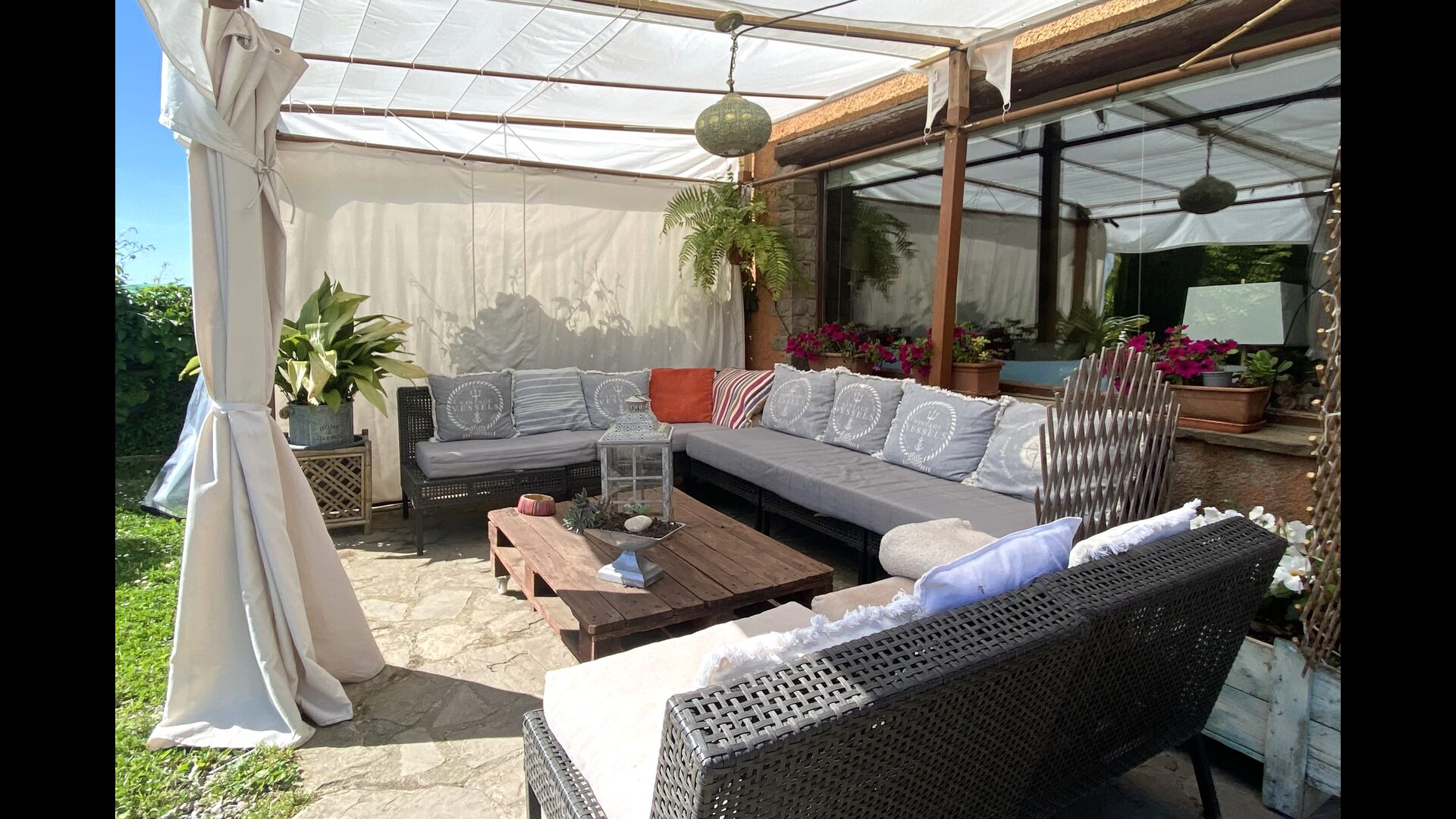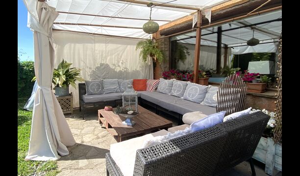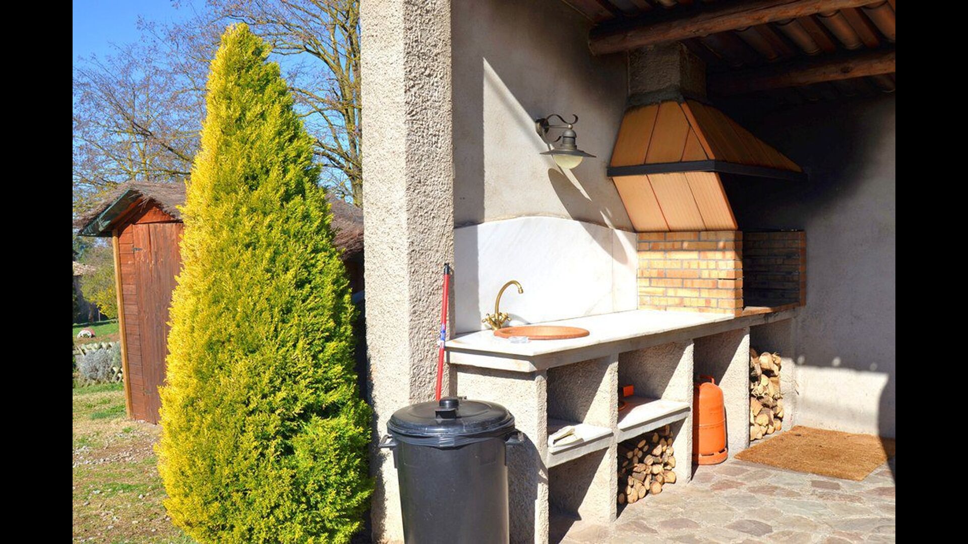 In the garden there is a fenced, private swimming pool (each of the two houses has its own pool) and at the end of the swimming pool is a covered terrace with BBQ and outdoor kitchen. There is also a small terrace in front of the house and on the lawn is set up a small pavilion, where you also can find shade on hot summer days.