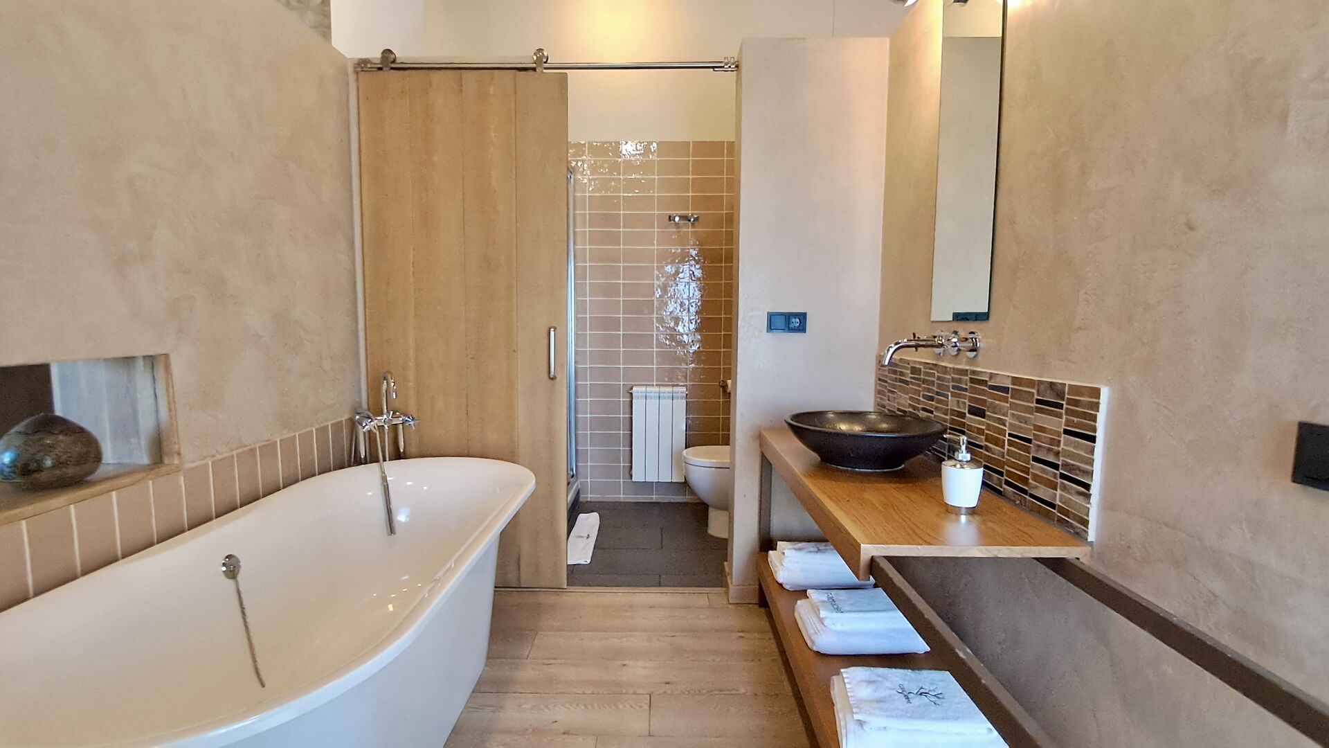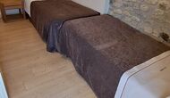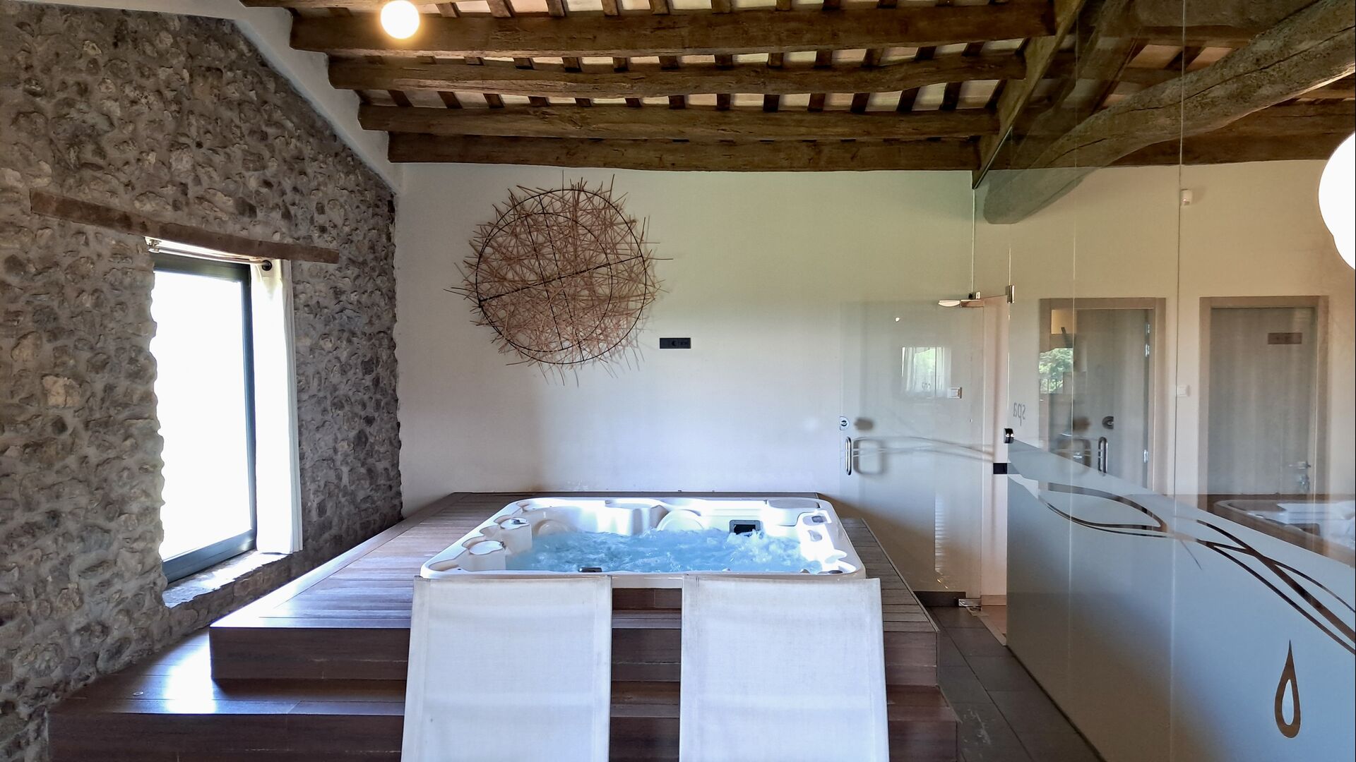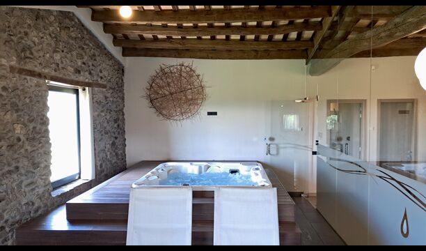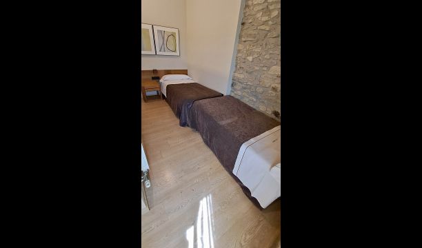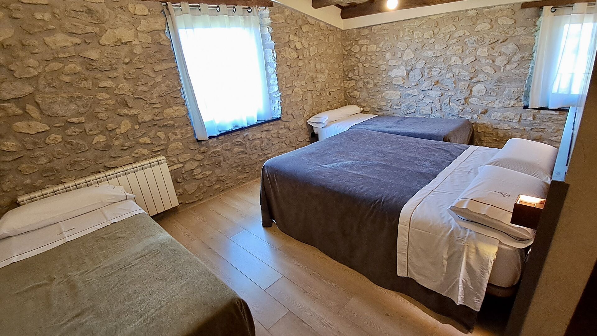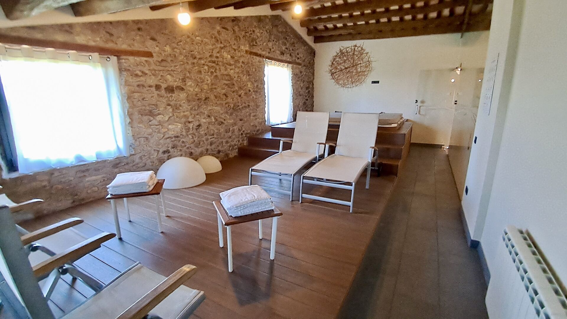 Au troisième et dernier étage se trouvent 4 autres chambres - comme toutes les autres, il y a une salle de bain pour chacune. En outre, vous trouverez un espace spa extrêmement délicieux avec un jacuzzi et des chaises longues. C'est l'endroit idéal pour se détendre. Sur les 9 chambres, il y a 4 chambres doubles (avec lits doubles), 3 chambres triples (avec lits simples) et 2 très grandes chambres avec 4 lits simples, ce qui est parfait pour les enfants ou les adolescents.