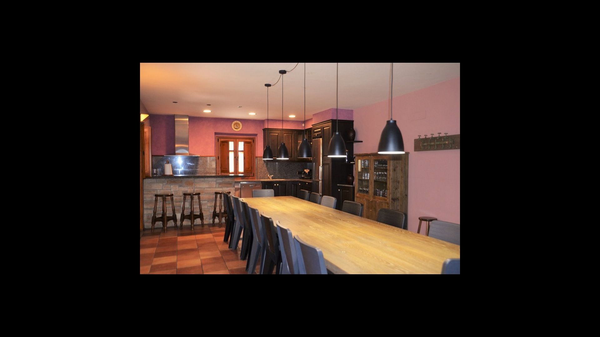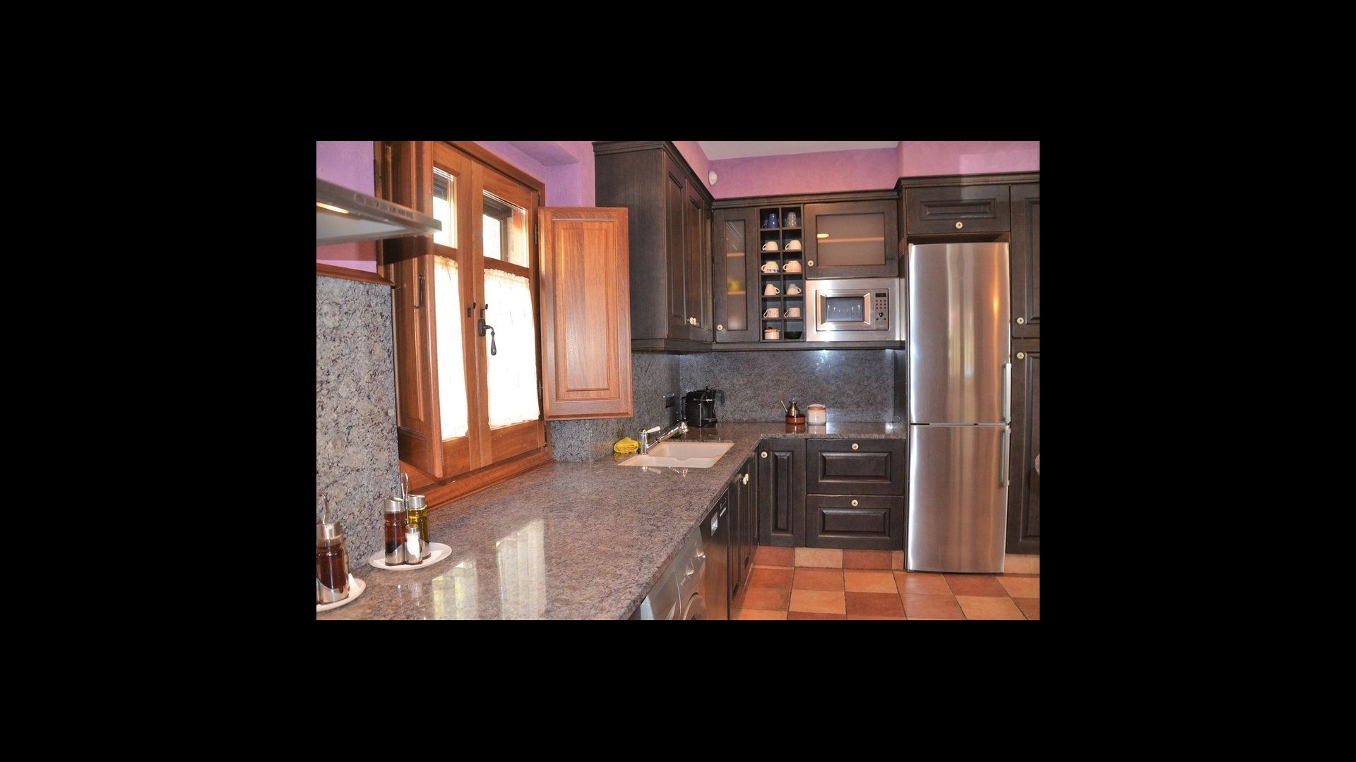 Au rez-de-chaussée se trouve une immense cuisine bien équipée avec un réfrigérateur, un congélateur, une cafetière, une cuisinière, deux lave-vaisselle, un four micro-ondes et d'autres ustensiles nécessaires. De plus, il y a un accès direct à la grande terrasse. Essayez de profiter du dîner à l'extérieur dans les chaudes soirées! Sinon, il y a une longue table à l'intérieur pouvant accueillir jusqu'à 22 personnes.