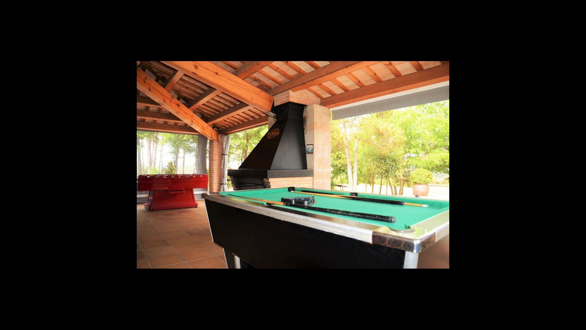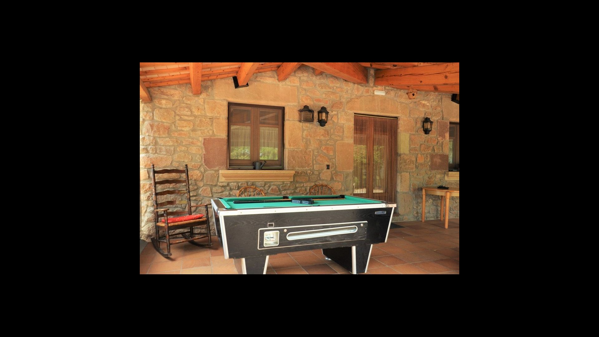 Il comprend un grand salon avec un coin canapé et une télévision à écran plat, un billard et un baby-foot. Il y a aussi une petite chambre avec des lits superposés et une salle de bain avec douche au rez-de-chaussée.