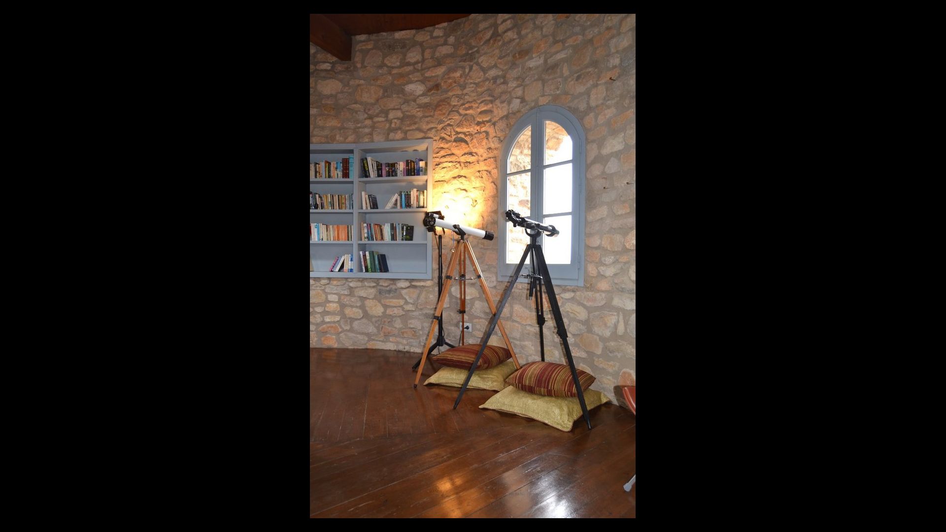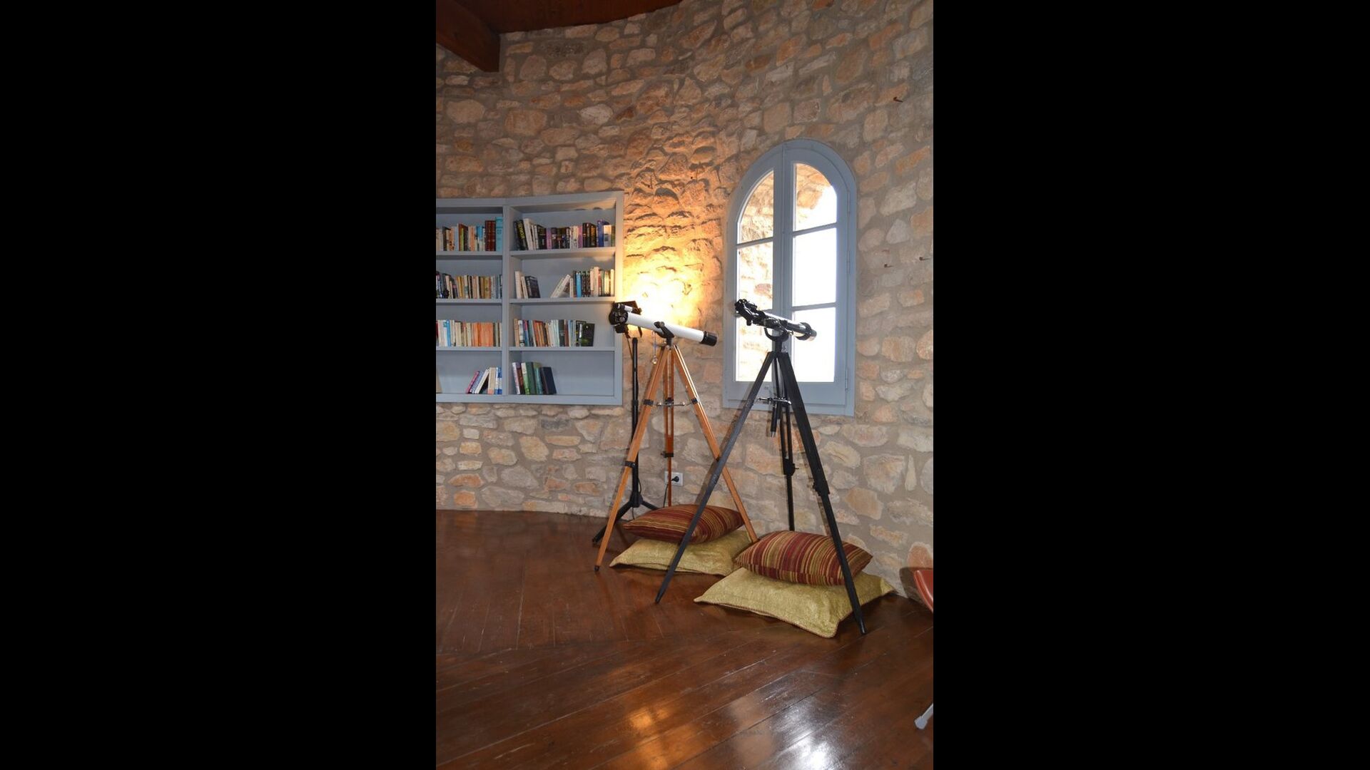 The construction, with the round tower in the middle of the castle, creates a very unique experience, as the round tower creates unique spaces, which can be explored all over the house. The jewel in the crown is the look out from the very top of the medieval tower. An excellent panoramic 360-degree view stretches all the way from the Pyrenees Mountains to their blending with the Mediterranean coast and the French border. Under the top terrace you will also find a small library with two astronomical telescopes. A perfect spot to stand, and explore the stars on a silent night.