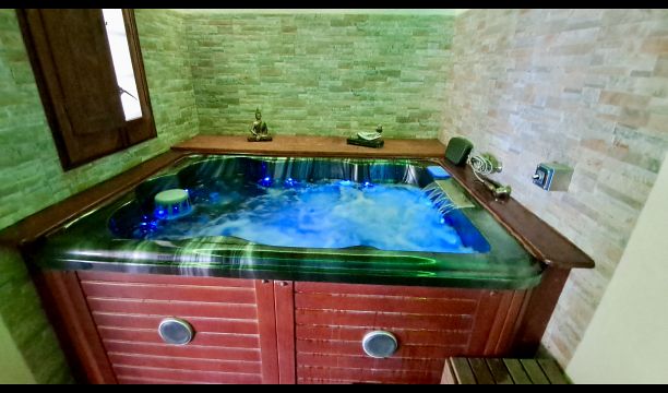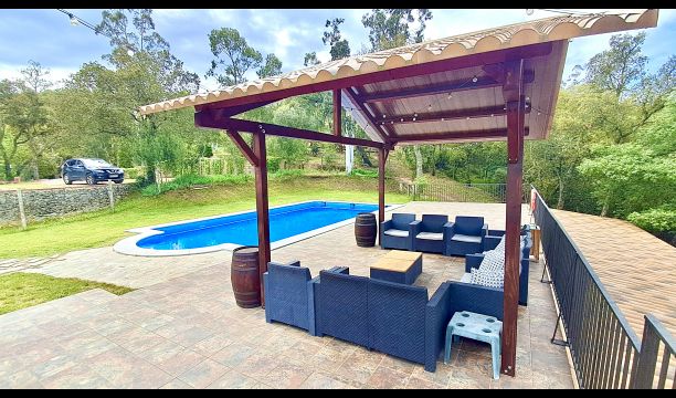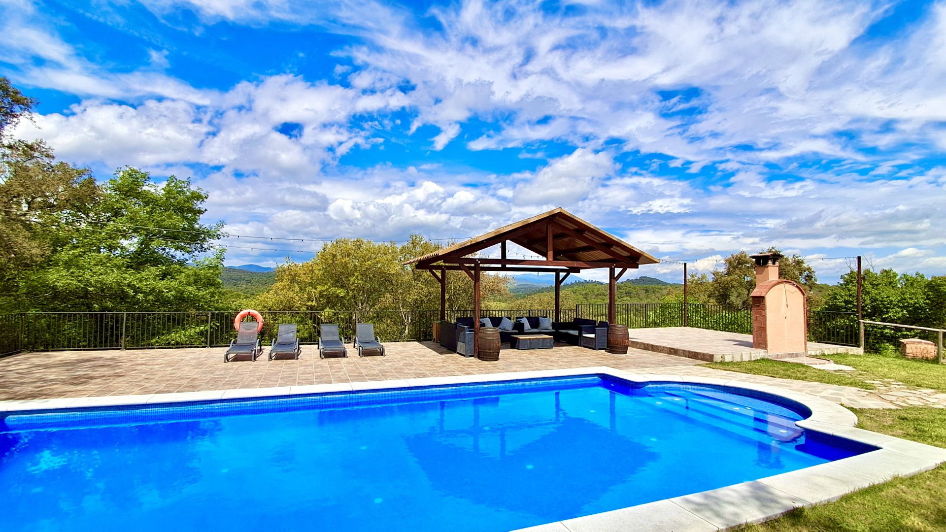 The garden has a size of 11,000 m2 - this is fully fenced so you can let the children play freely on the property. The pool, which is self-cleaning, is also large and has a size of 55 m2, and the pool area is wonderful: Since the house lies on top of a hill, there is a great view over hilly countryside that you can enjoy from the many sun loungers. There is also a small cover, which you can find shade under when the sun is high in the sky.