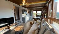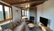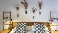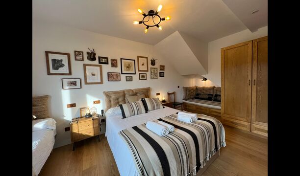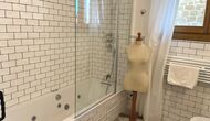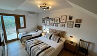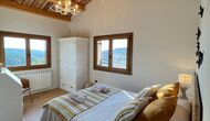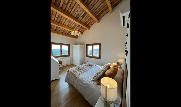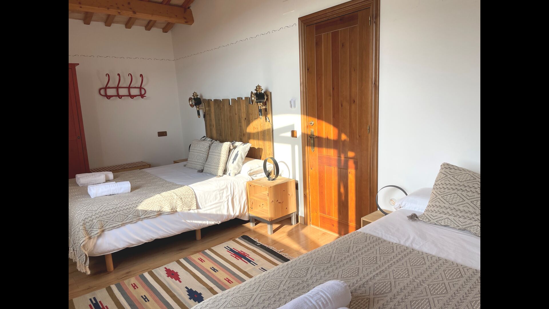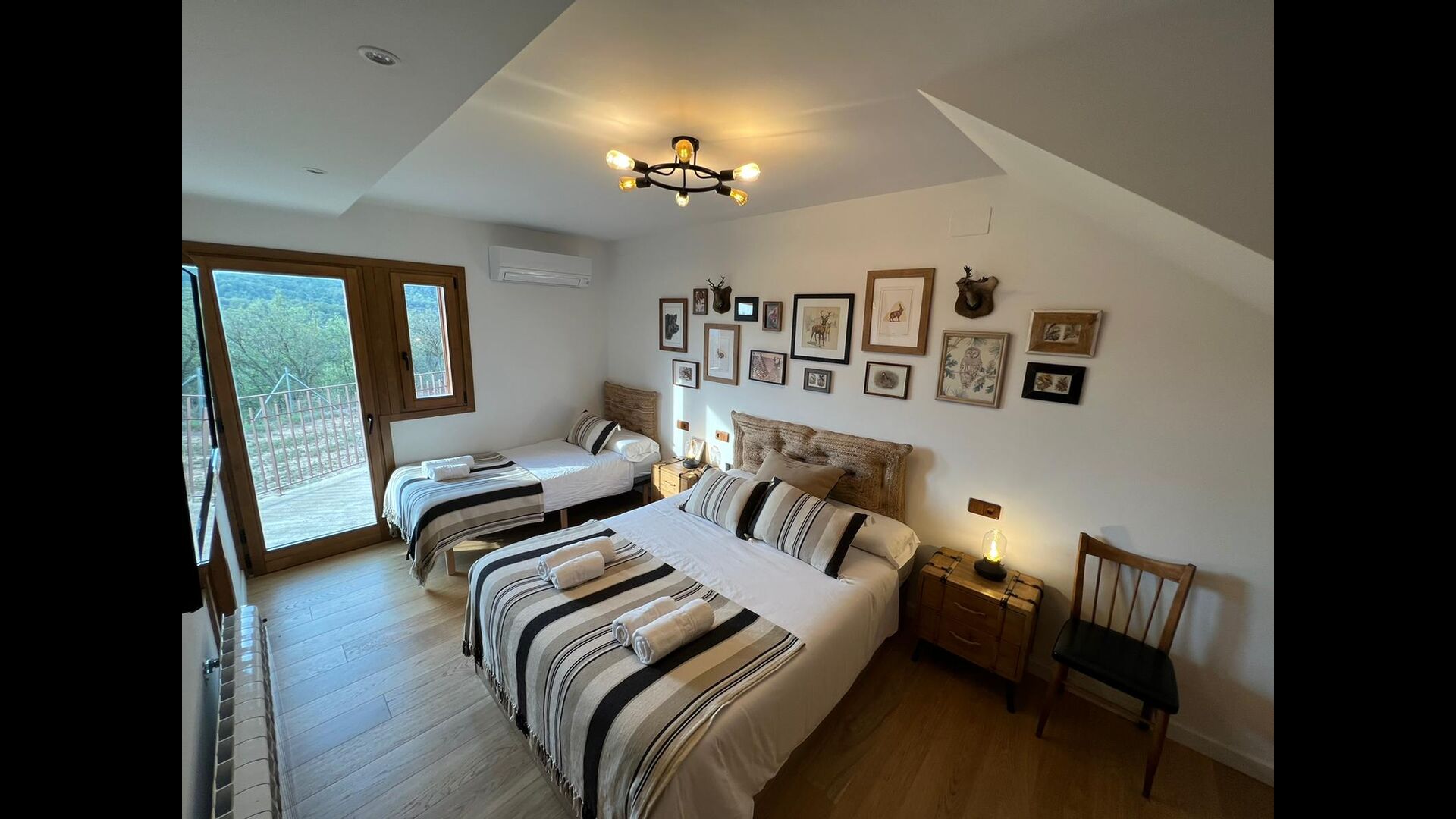 Au même étage, vous trouverez une deuxième chambre, qui a un lit double et un lit simple. Les lits ont une vue directe sur la vallée et comme le bâtiment est juste en bordure, il y a aussi une terrasse privée avec accès direct depuis la chambre. Ensuite, il y a la grande salle de bain avec baignoire pleine grandeur.