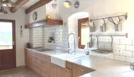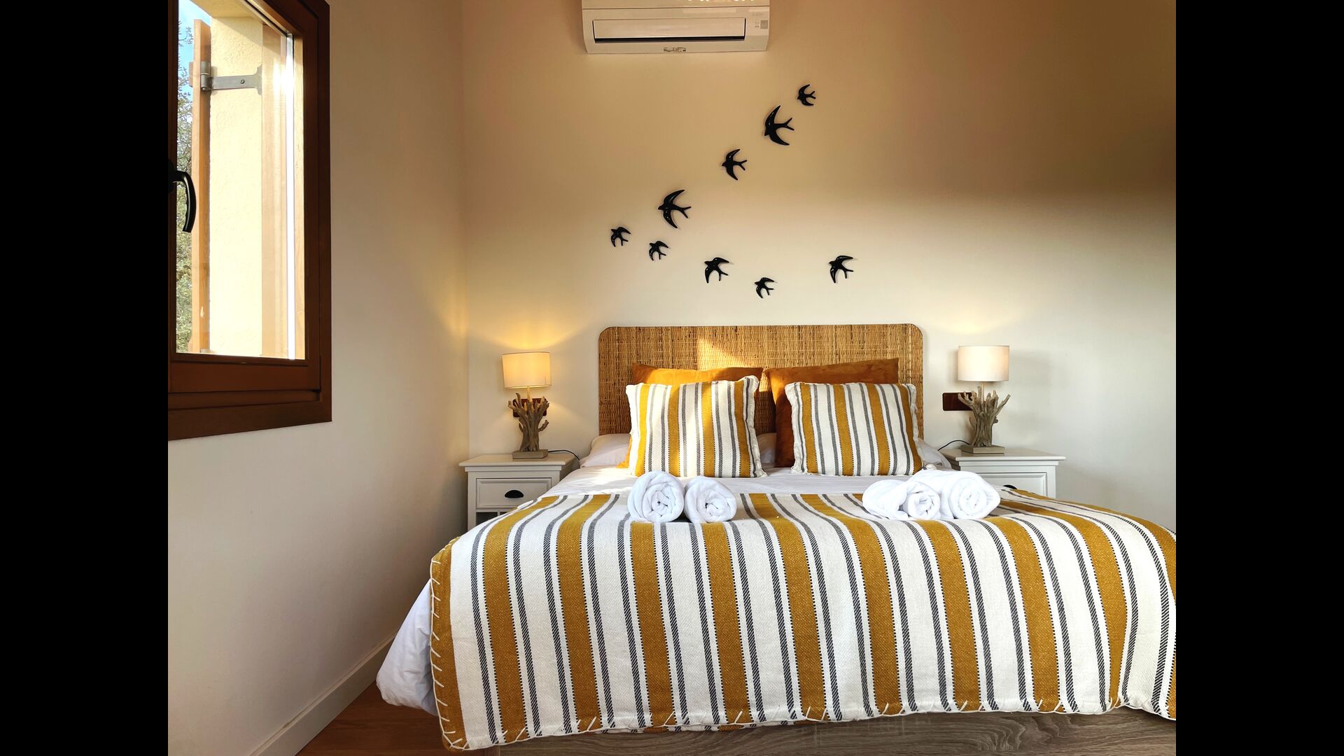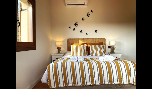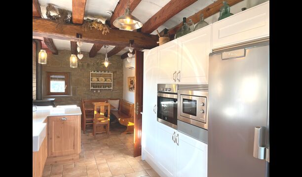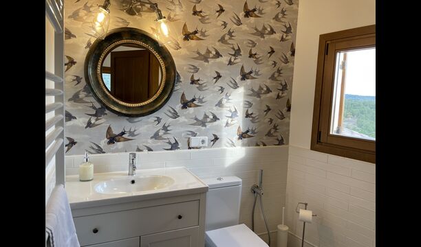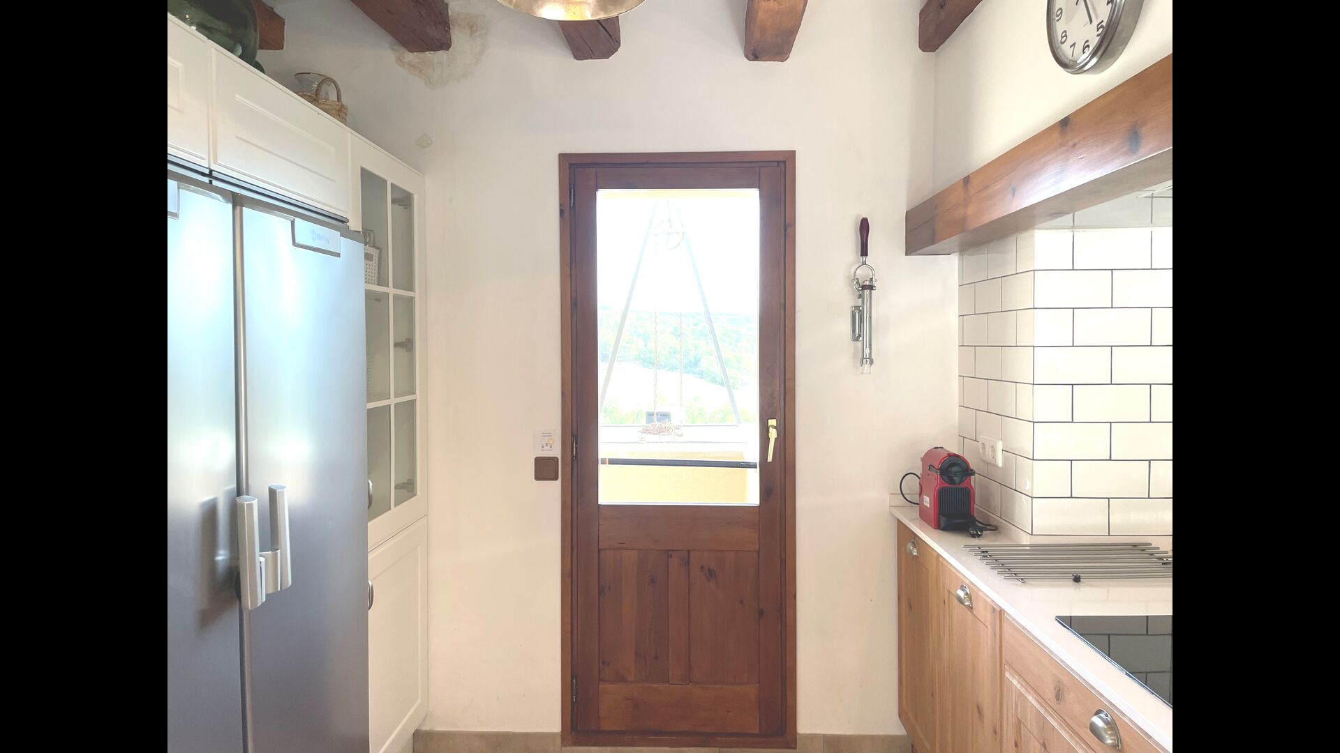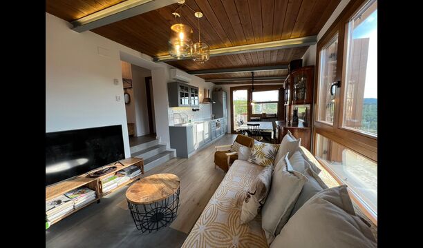 Sur le plan au sol il y a une belle chambre double avec un lit double, qui a un accès direct au jardin et une belle salle de bain attenante. Il y a aussi des toilettes, un salon avec une mini boutique, où vous pourrez acheter de la bière, du café et de délicieux produits locaux. En montant les escaliers jusqu'au 1er étage, vous entrerez dans la cuisine très moderne avec des comptoirs en corian blanc, un grand réfrigérateur, un congélateur, un four, un micro-ondes, une bouilloire – en bref : tout ce dont une cuisine a besoin. De la cuisine, il y a même une sortie sur un petit balcon où vous pourrez déguster votre café du matin avec une vue imprenable sur la nature catalane.