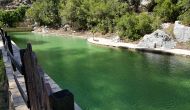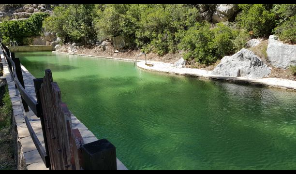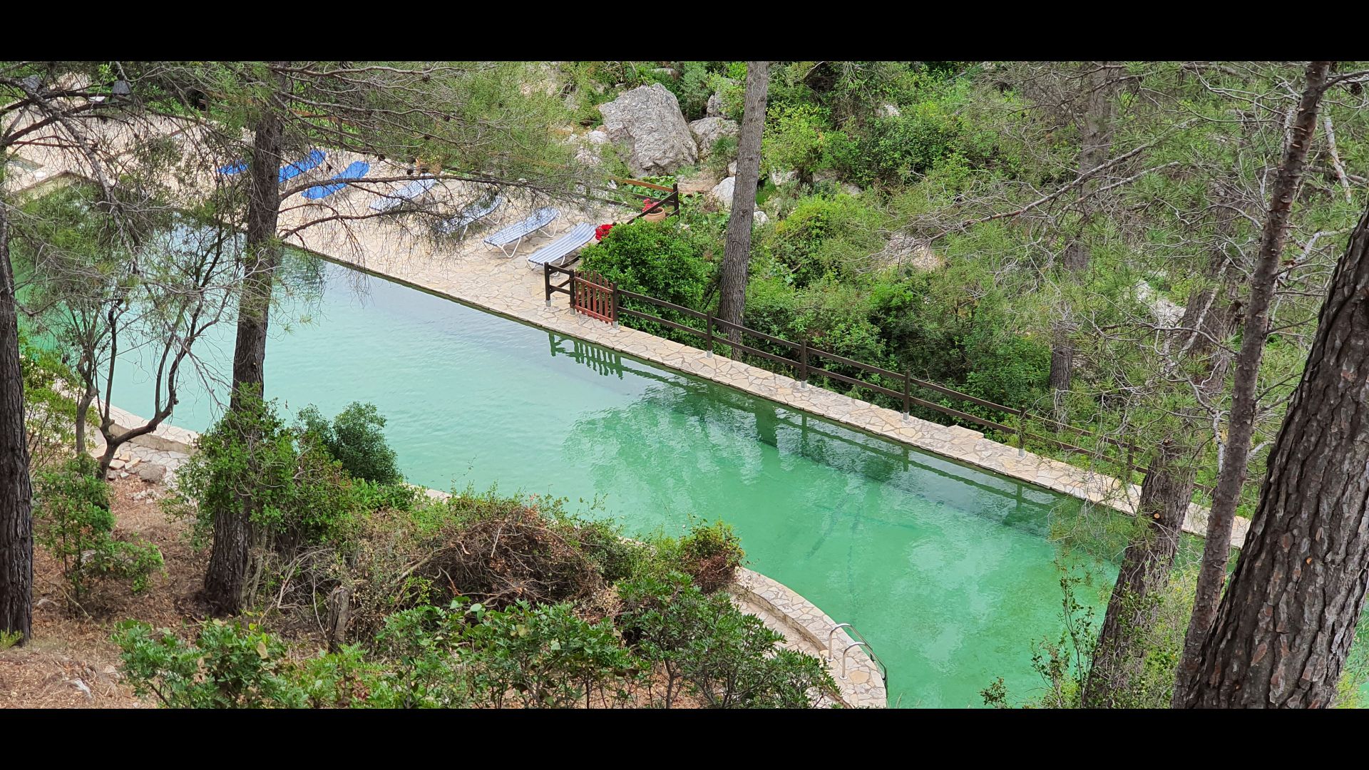 L'atmosphère extérieure est difficile à décrire avec des mots, car l'endroit est très spécial. La cascade donne de la fraîcheur et les rochers environnants donnent de nombreux coins ombragés et une impression de ne faire qu'un avec la nature. Les systèmes de canaux utilisés pour diriger l'eau afin de créer l'énergie nécessaire au moulin à eau ont été intelligemment conduits à un piscine, où cette eau propre, provenant directement de la source à quelques kilomètres de la maison, traverse la piscine de 45 mètres de longueur, puis à nouveau sur la rivière à l'autre bout. Vous pouvez également nager sous la cascade et à différents endroits de la rivière.