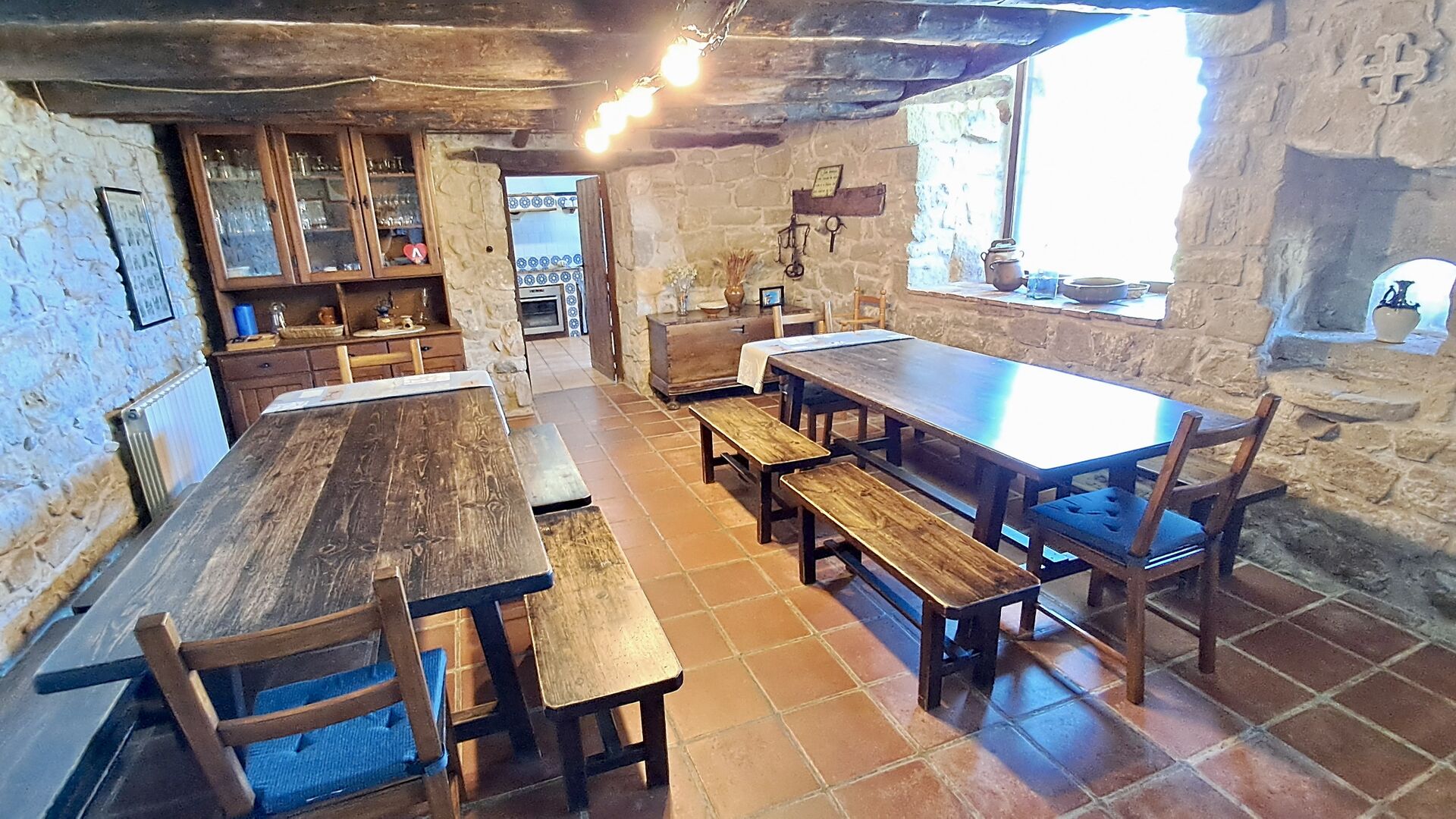 From the large garden with pool and small flowers beds, you can reach the kitchen by direct entrance from the terrace. The kitchen is in classic Catalan style with the necessary kitchen facilities. Many of the more authentic and worn parts are still in the holiday home and give the house a very classic style. It is perfect for those, who value the historical touch and do not mind that not all details are up to date and new. On the ground floor there is also an extra room with iron, ironing board, washing machine, extra fridge, and freezer. There is access to the indoor dining room from the kitchen.