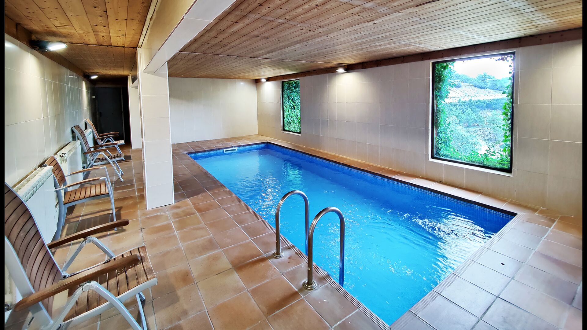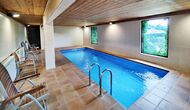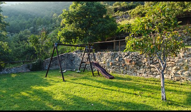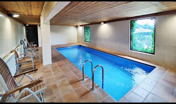 La propriété comprend une piscine extérieure privée avec transats et un jardin avec balançoires pour les enfants. Dans un bâtiment voisin, les invités trouveront également une piscine intérieure chauffée et une terrasse barbecue couverte, permettant de nager et de manger en plein air toute l’année.