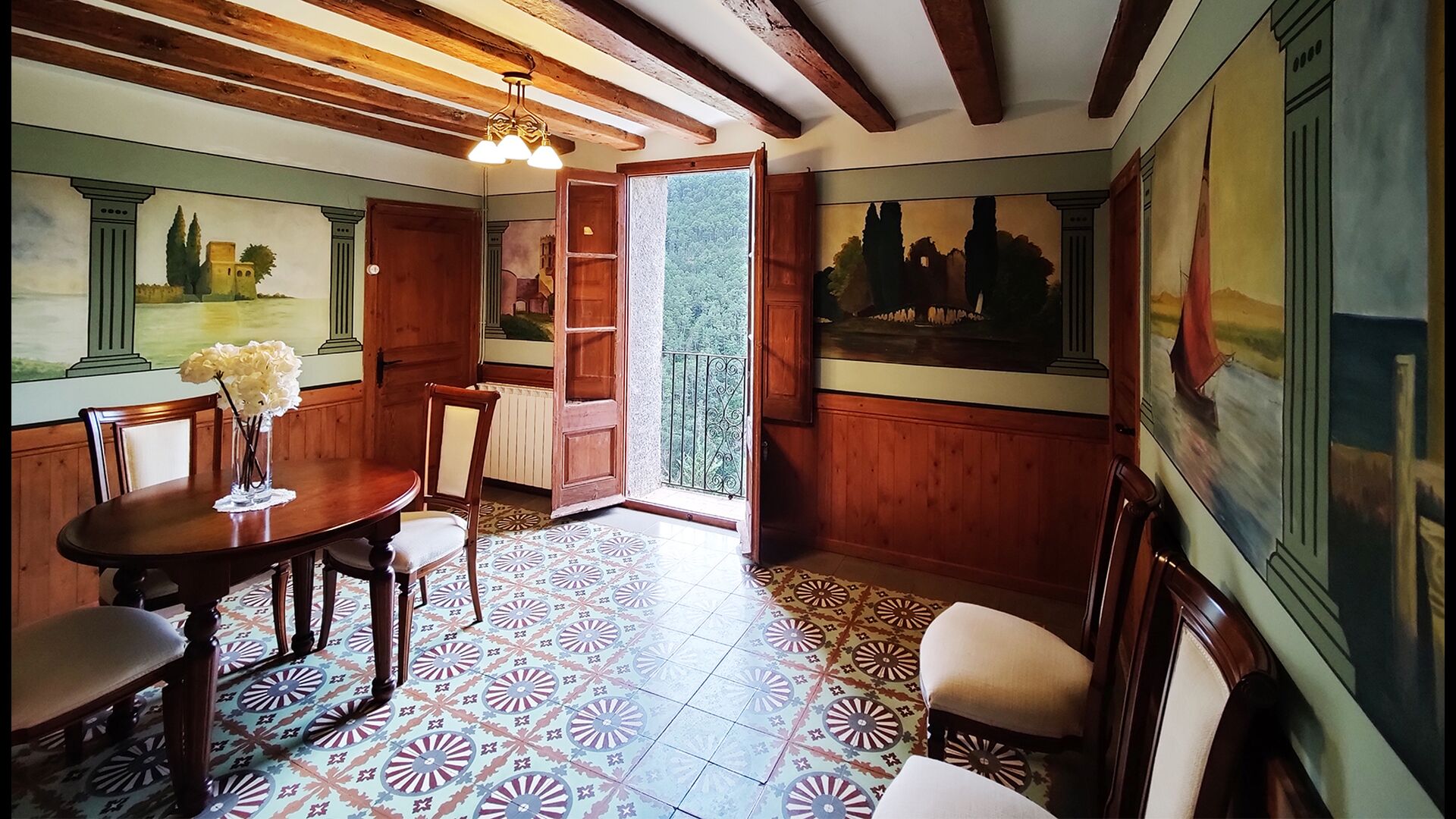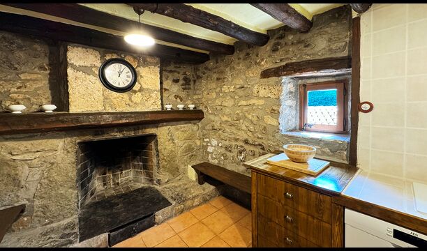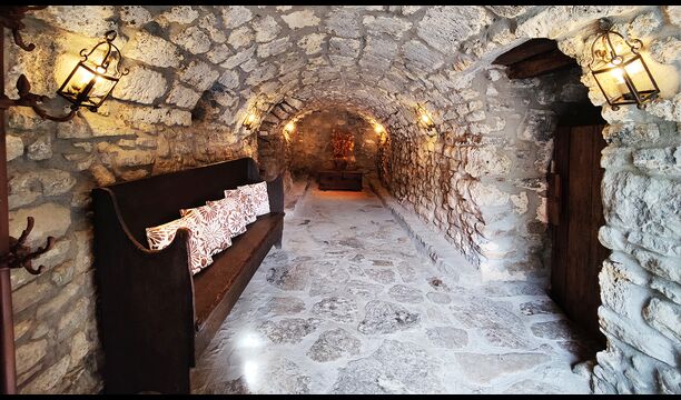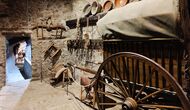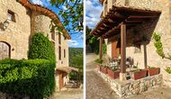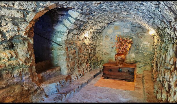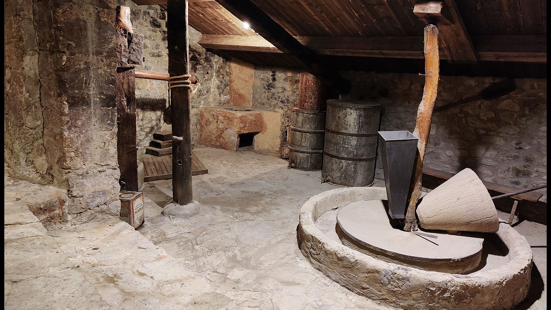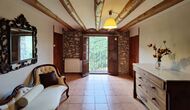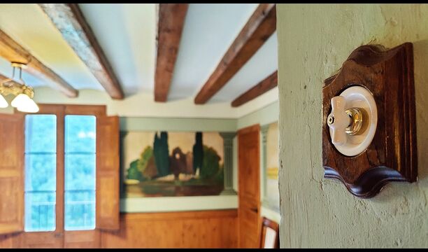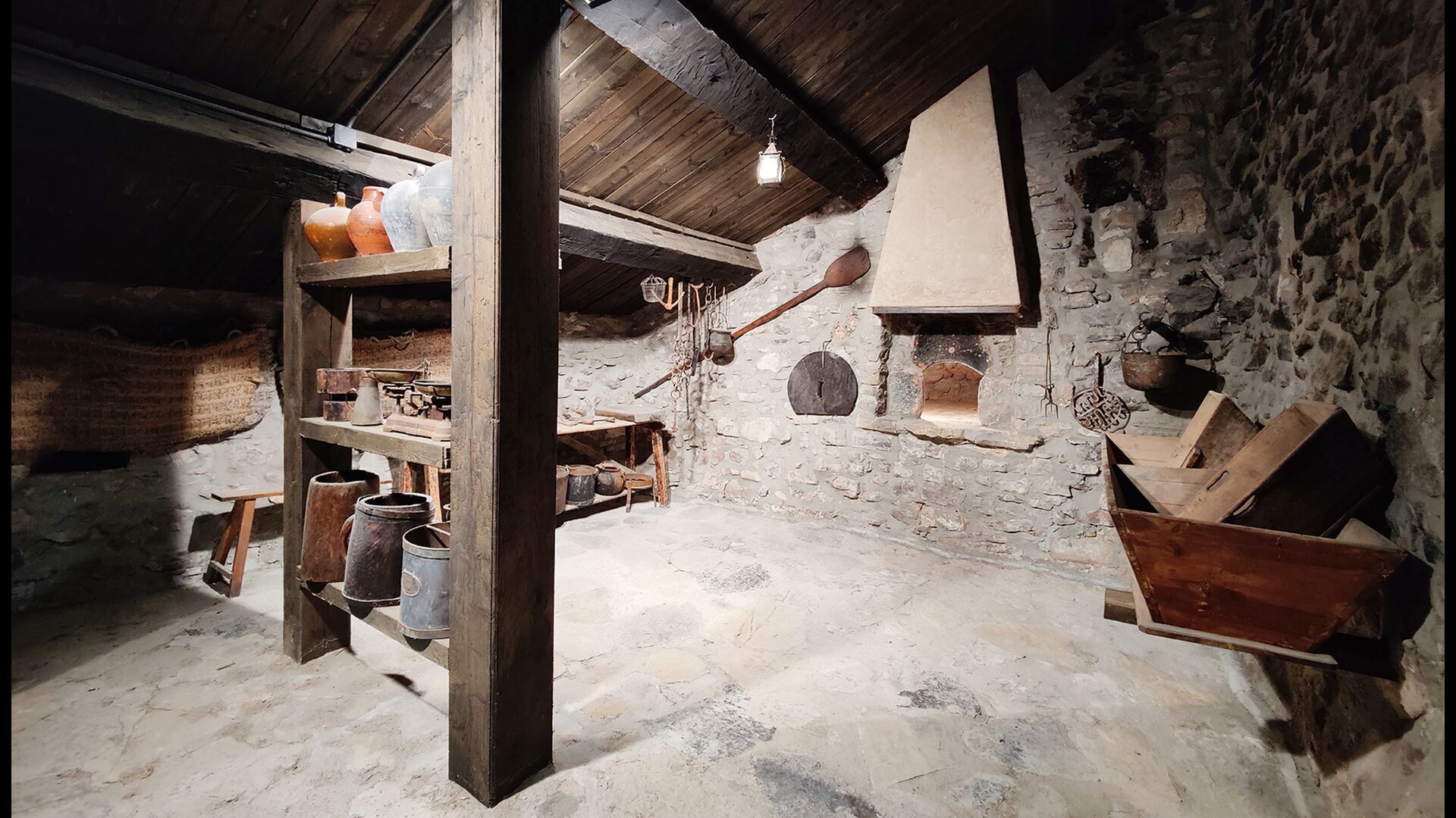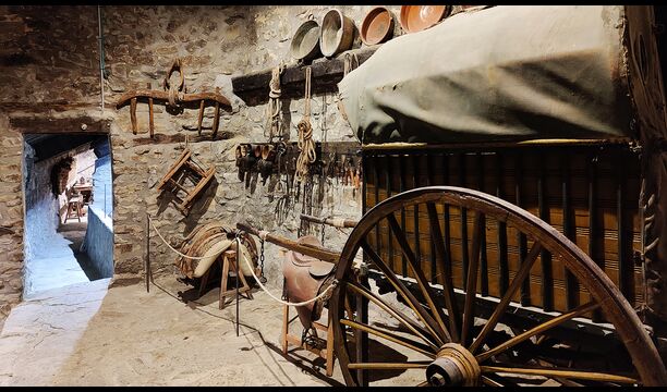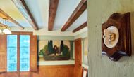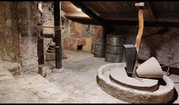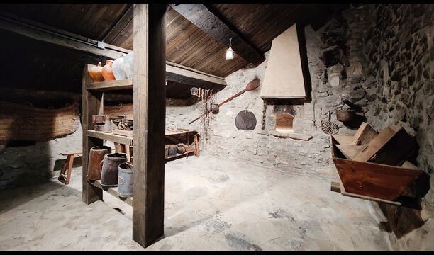 La propriété possède d’épais murs en pierre, une solide porte d’entrée en bois et même des fresques du XVIIIe siècle préservées, témoignant de la longue histoire de ce domaine rural traditionnel. Une petite chapelle et un musée reliés à la maison présentent des outils et des espaces illustrant la vie quotidienne dans une ferme de montagne autosuffisante autrefois.