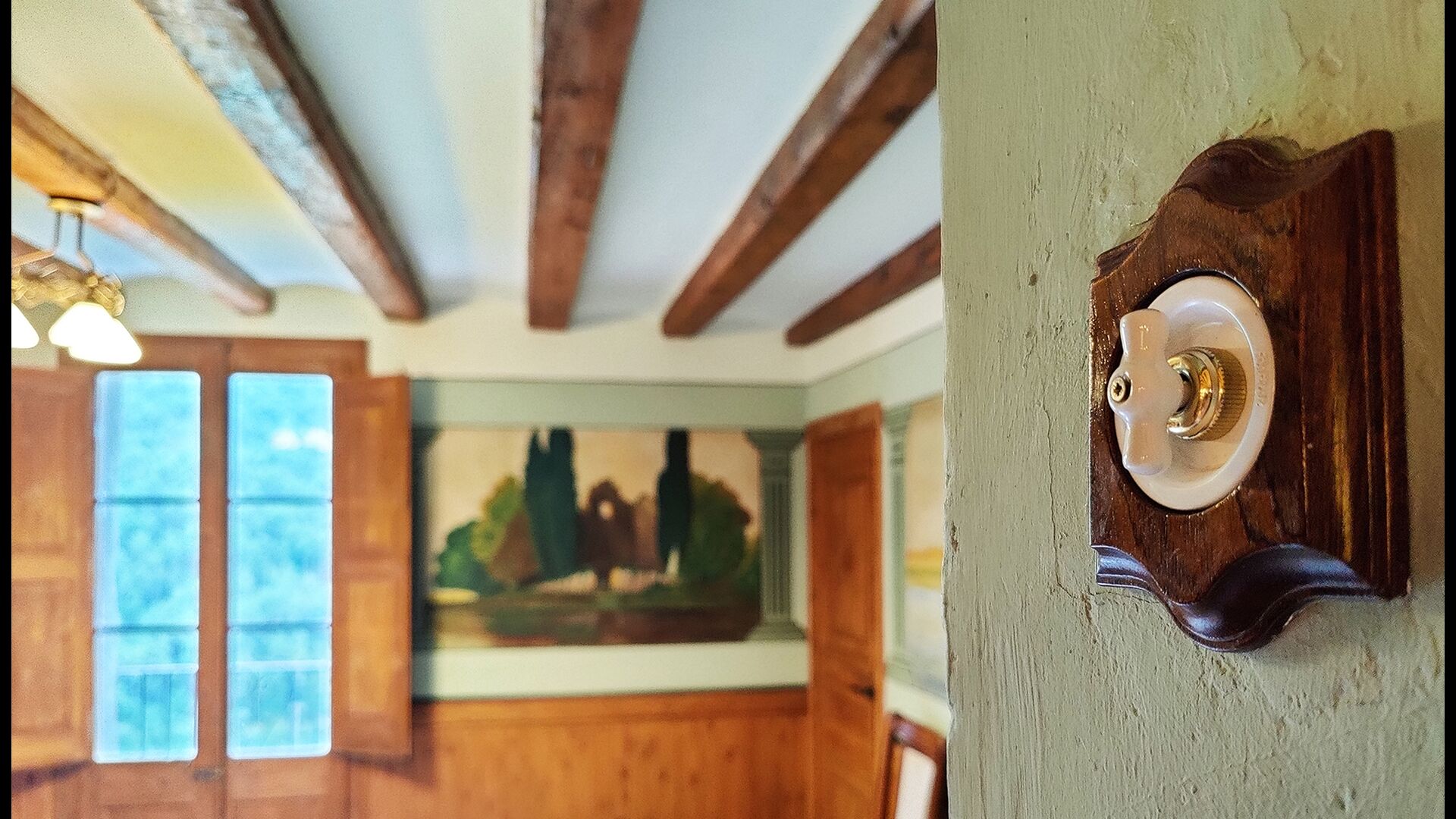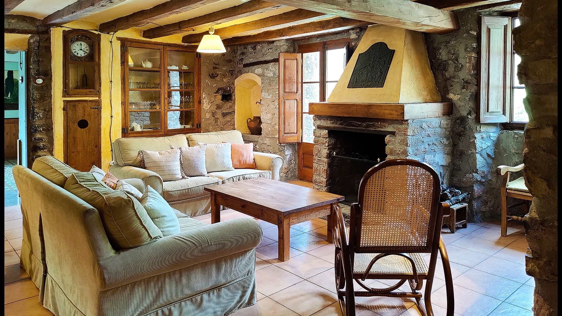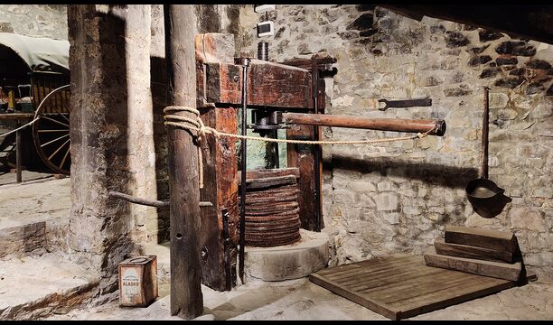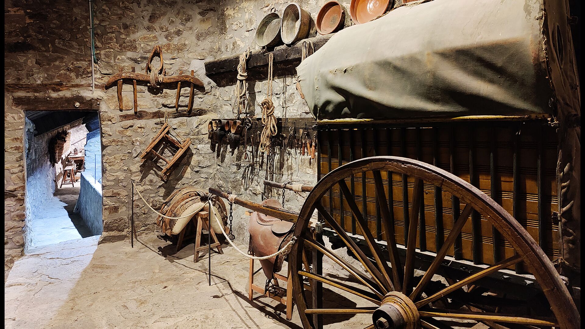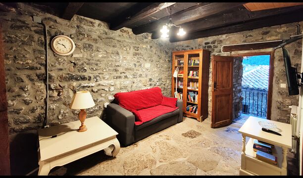 La propriété possède d’épais murs en pierre, une solide porte d’entrée en bois et même des fresques du XVIIIe siècle préservées, témoignant de la longue histoire de ce domaine rural traditionnel. Une petite chapelle et un musée reliés à la maison présentent des outils et des espaces illustrant la vie quotidienne dans une ferme de montagne autosuffisante autrefois.