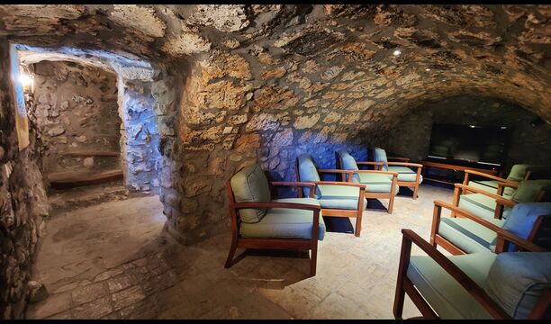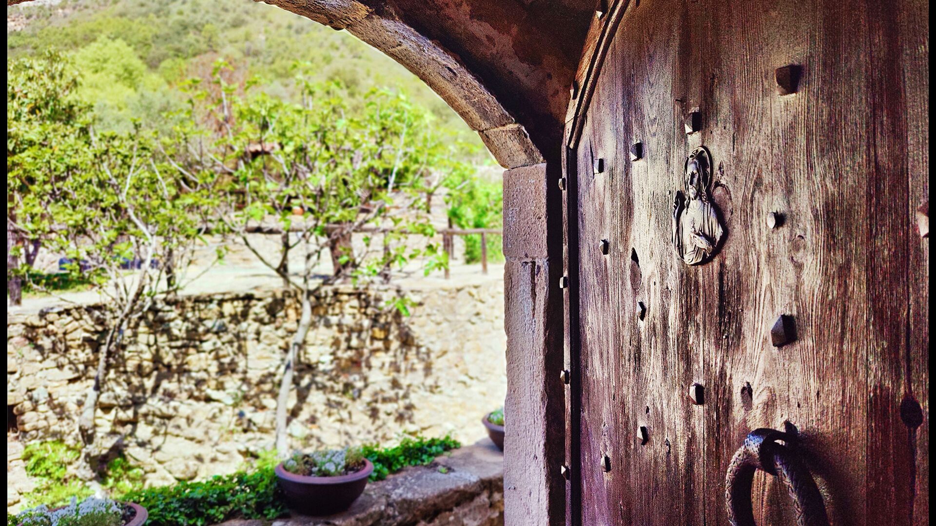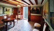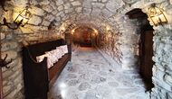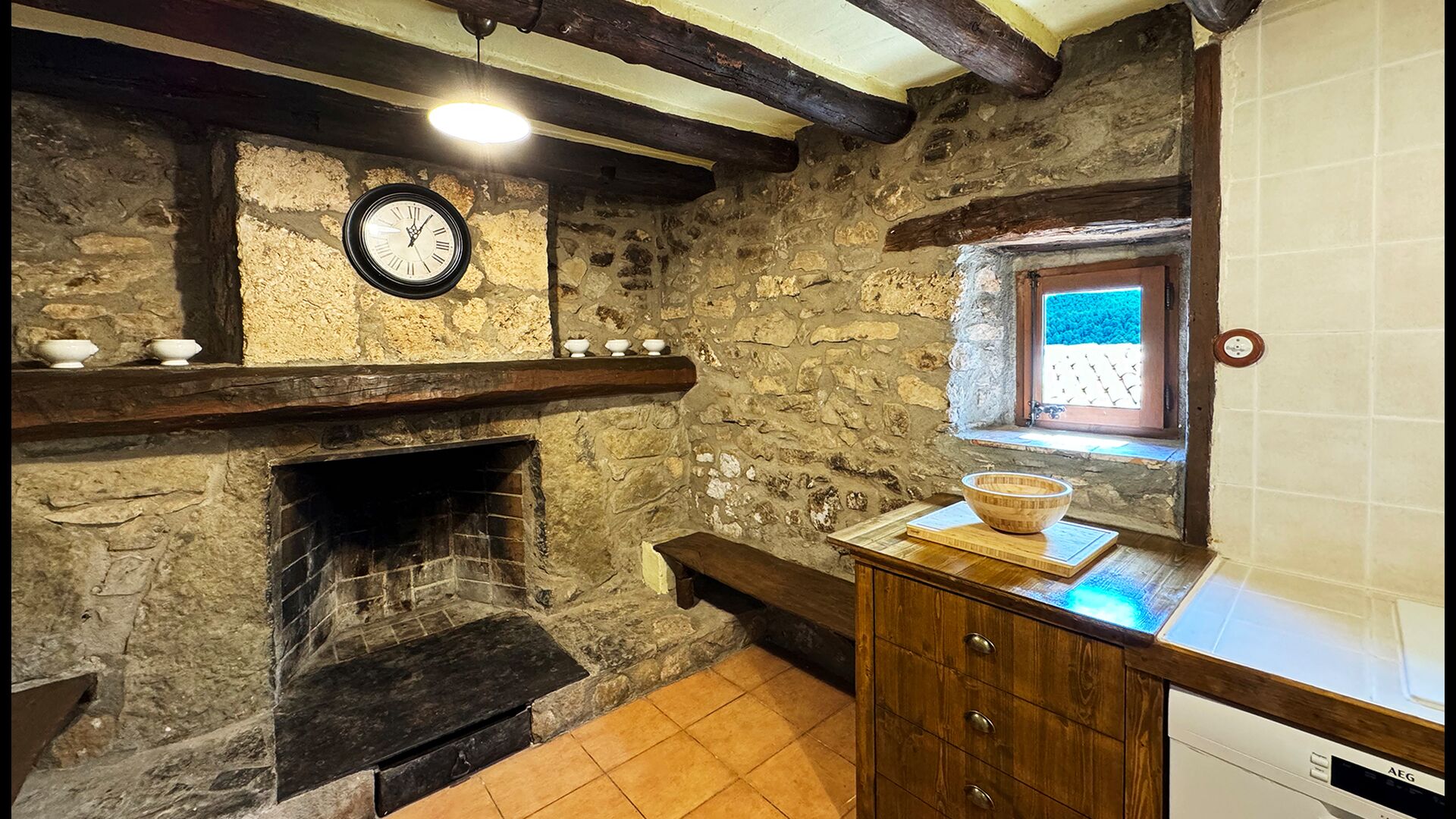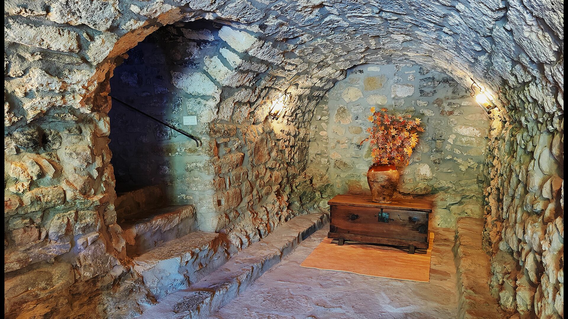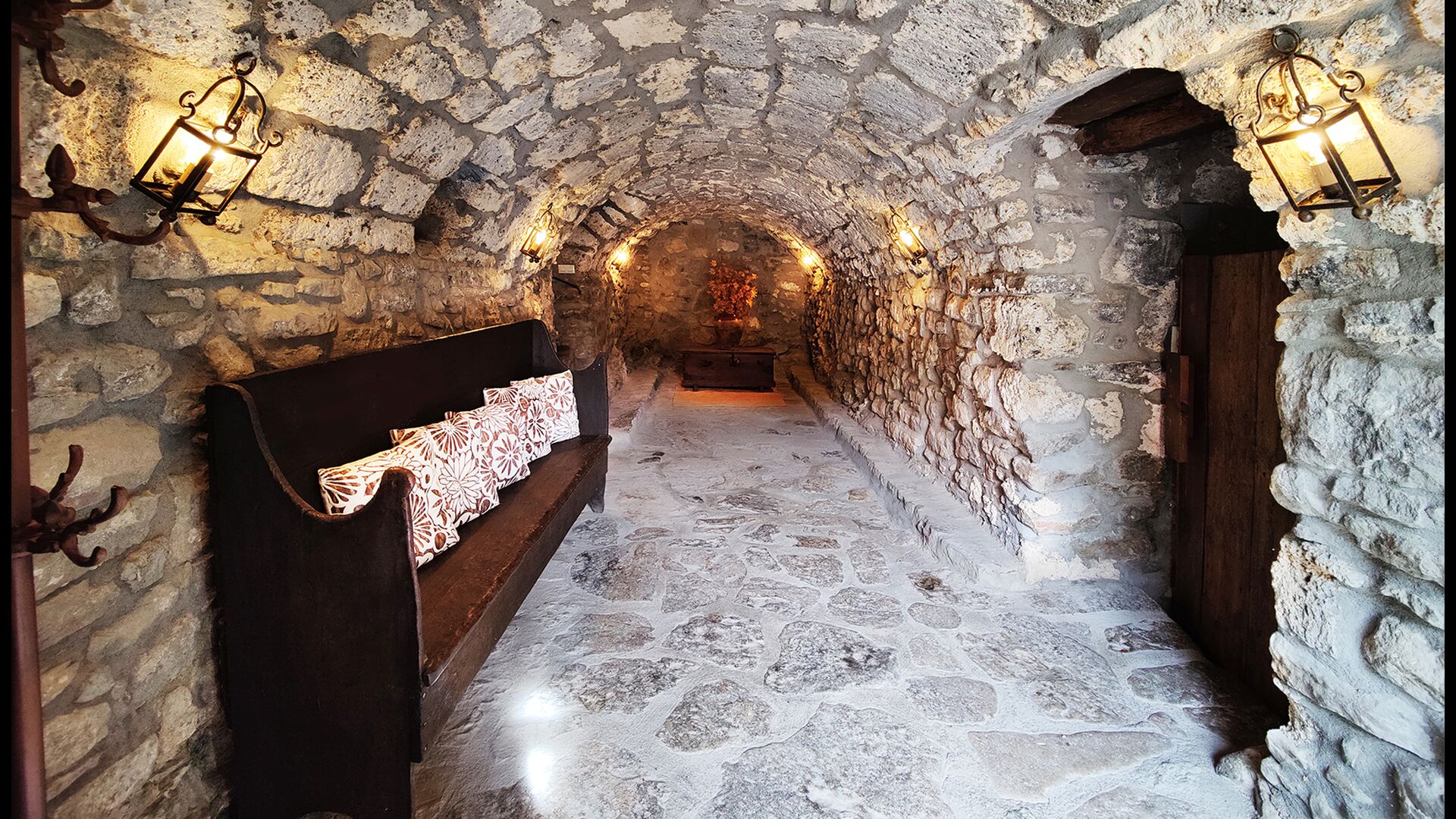 La propriété possède d’épais murs en pierre, une solide porte d’entrée en bois et même des fresques du XVIIIe siècle préservées, témoignant de la longue histoire de ce domaine rural traditionnel. Une petite chapelle et un musée reliés à la maison présentent des outils et des espaces illustrant la vie quotidienne dans une ferme de montagne autosuffisante autrefois.