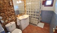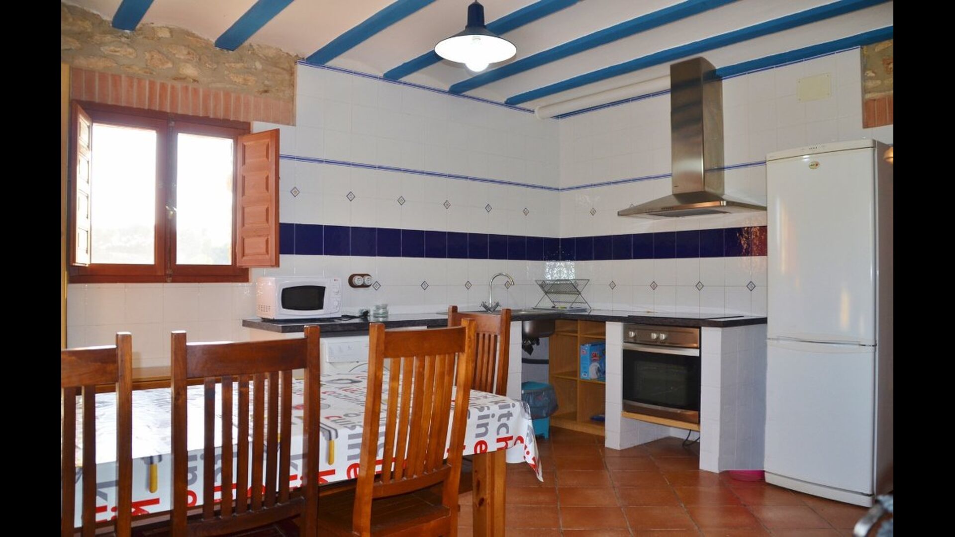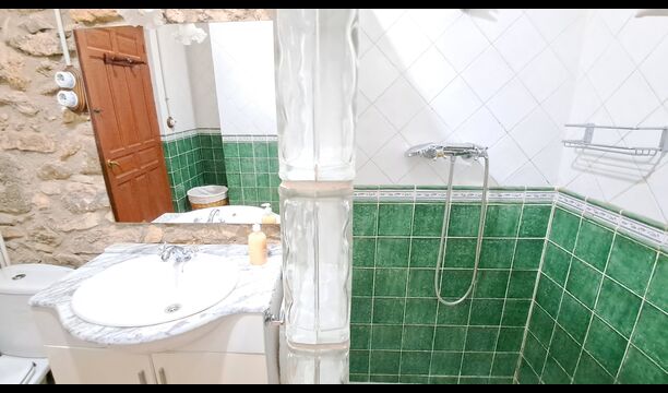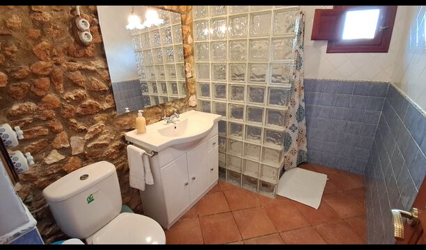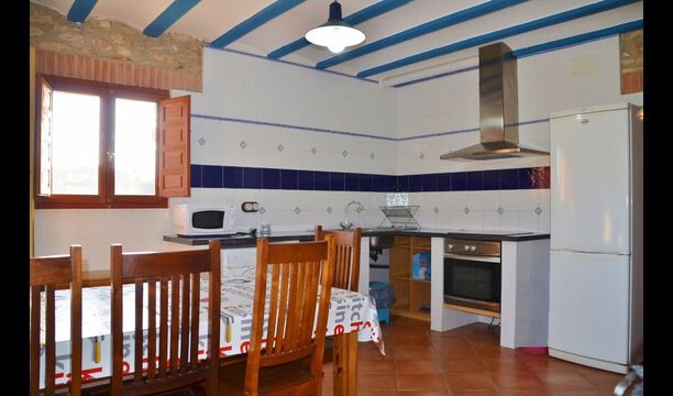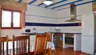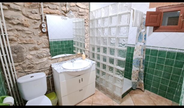 Au rez-de-chaussée, vous trouverez la cuisine bien équipée avec un lave-vaisselle, des plaques vitrocéramiques, un four, un four micro-ondes, un réfrigérateur, un congélateur et un lave-linge. Il y a aussi deux chambres, une avec un lit double et une avec un lit superposé. Ils partagent une salle de bain avec douche. Enfin, il y a la grande salle commune avec canapés et télévision. Il y a aussi une salle à manger avec accès à une petite terrasse.