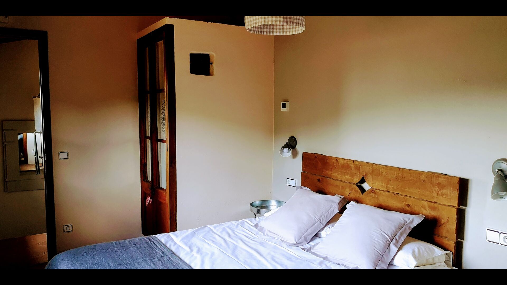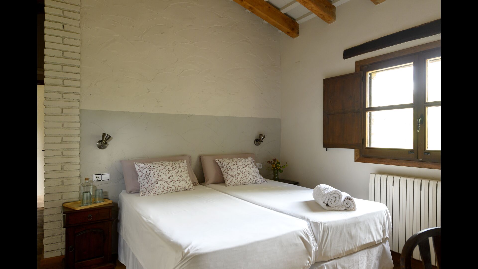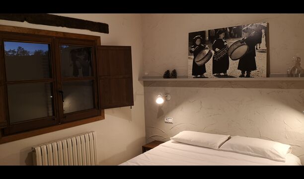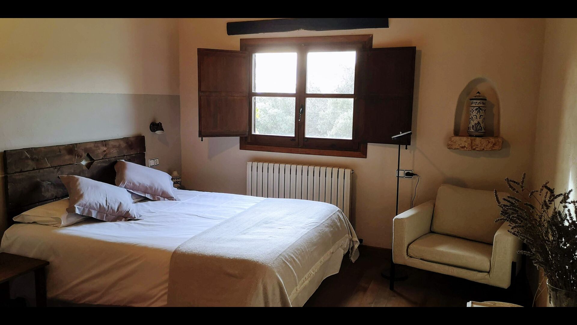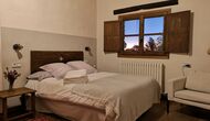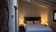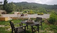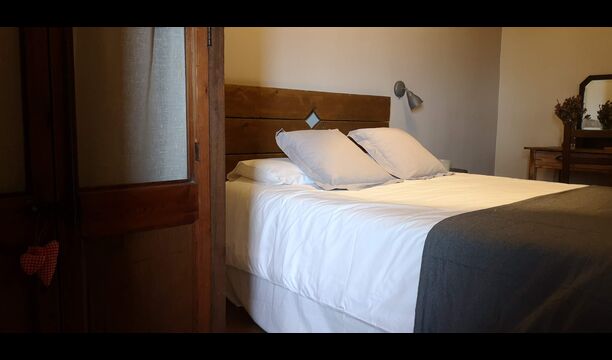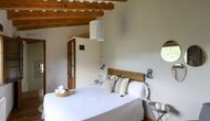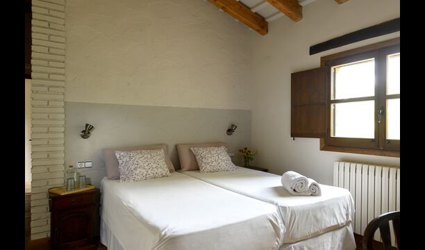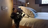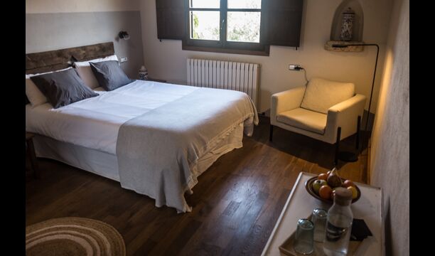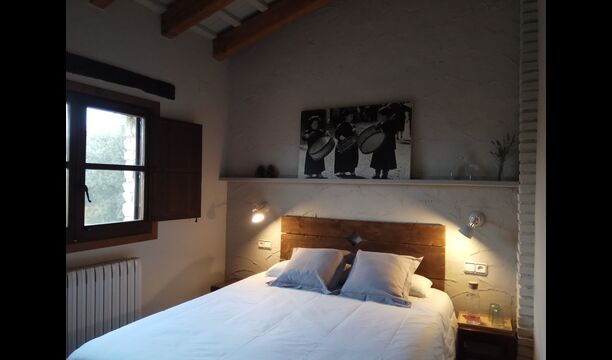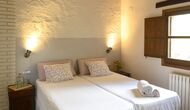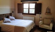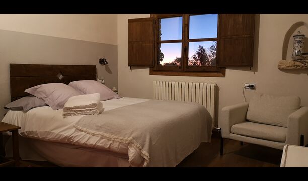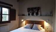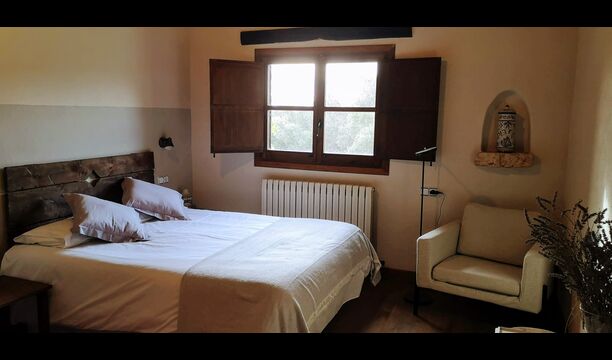 -          Mont-Ral : Une chambre avec 1 lit double et une salle de bain attenante, équipée d'une petite table catalane classique en bois et vue sur le jardin et les montagnes. Les dimensions du lit sont 150x190cm.