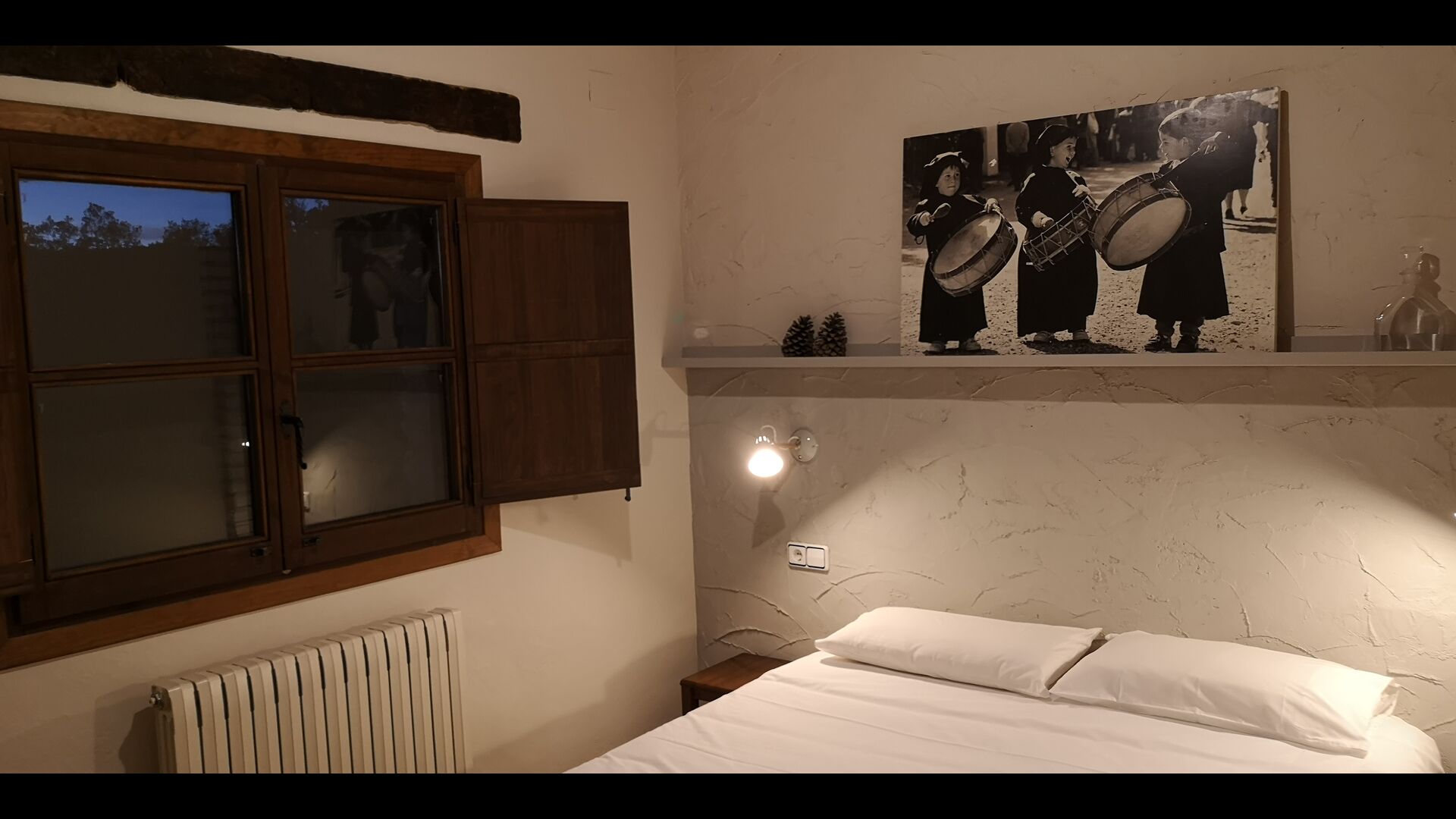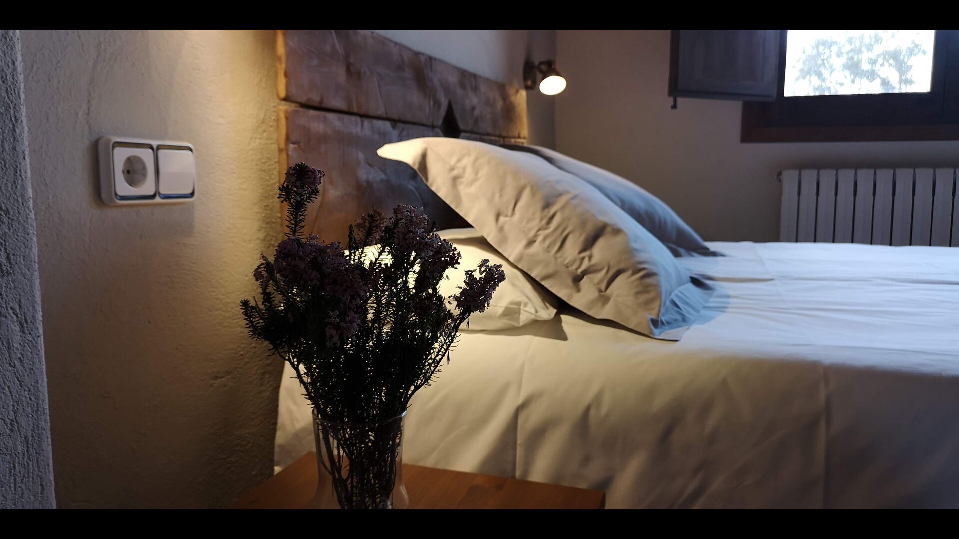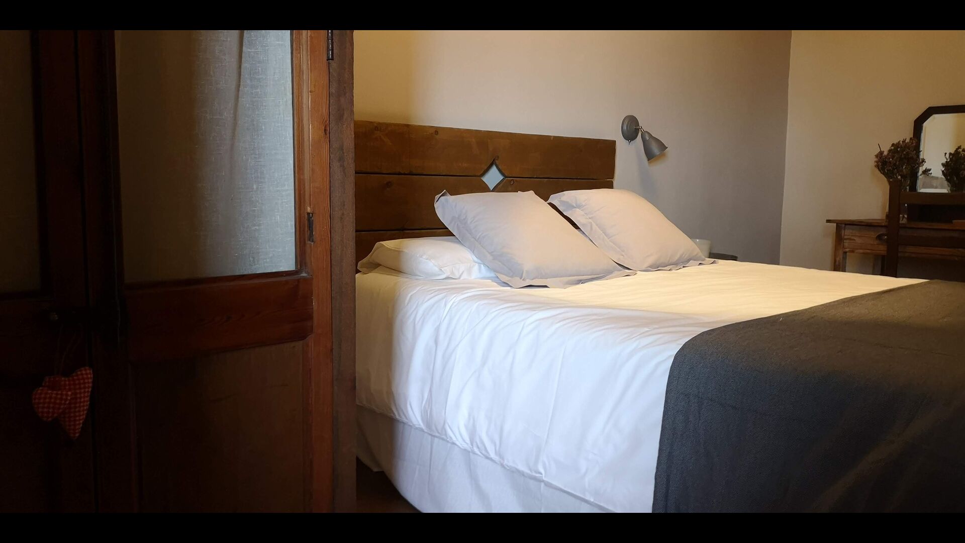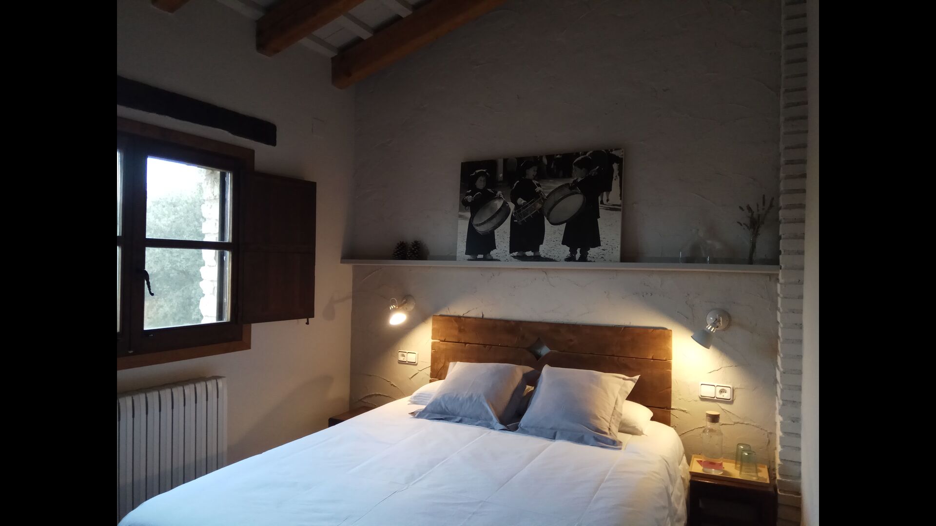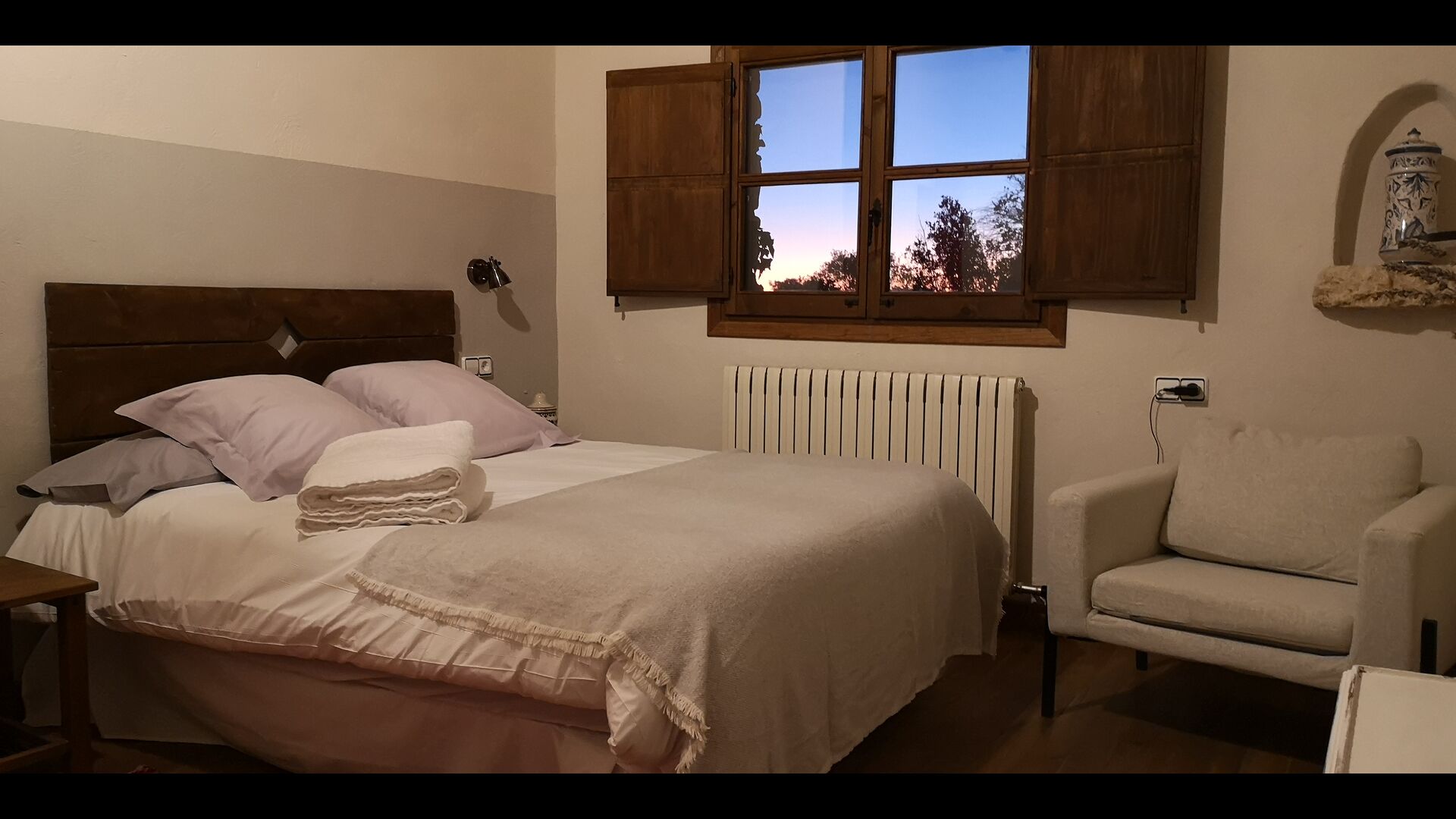 -          Mont-Ral : Une chambre avec 1 lit double et une salle de bain attenante, équipée d'une petite table catalane classique en bois et vue sur le jardin et les montagnes. Les dimensions du lit sont 150x190cm.