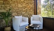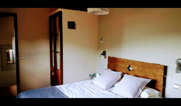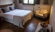 -          Rojals : Une chambre avec 1 lit double et une salle de bain attenante, offrant une superbe vue sur le jardin et un coin lecture avec un canapé chaise et possibilité d'un lit supplémentaire (35 EUR). Les dimensions du lit sont 180x190cm.