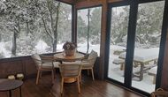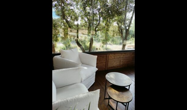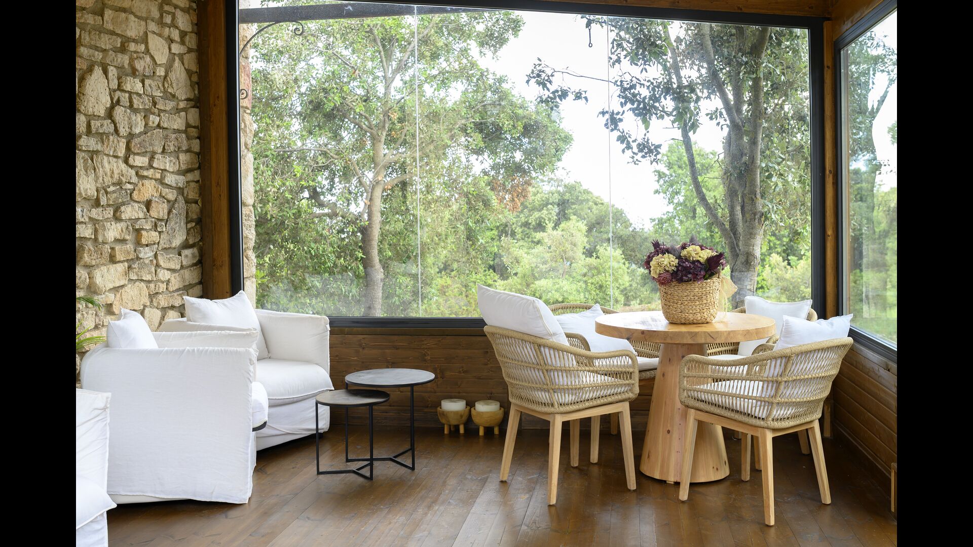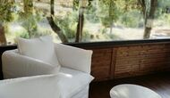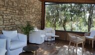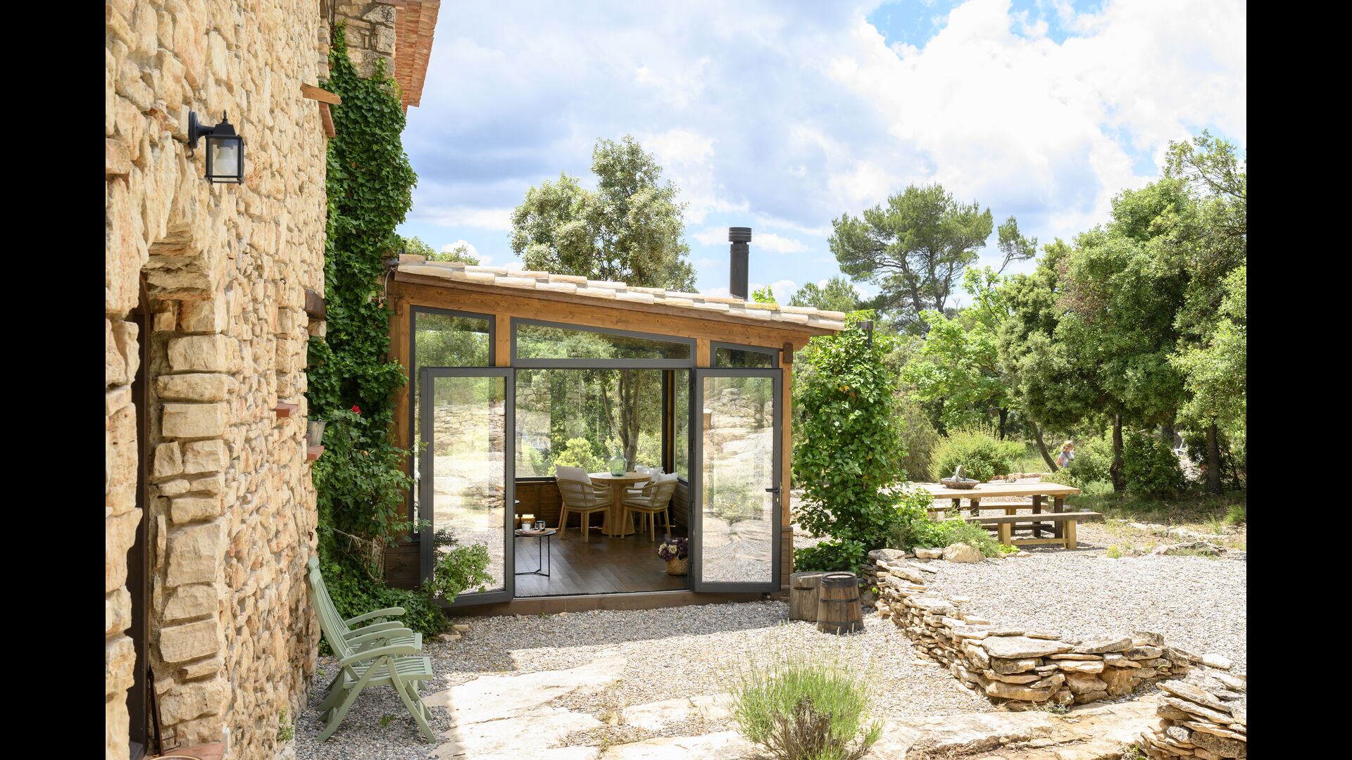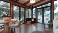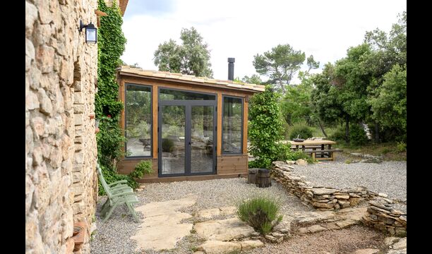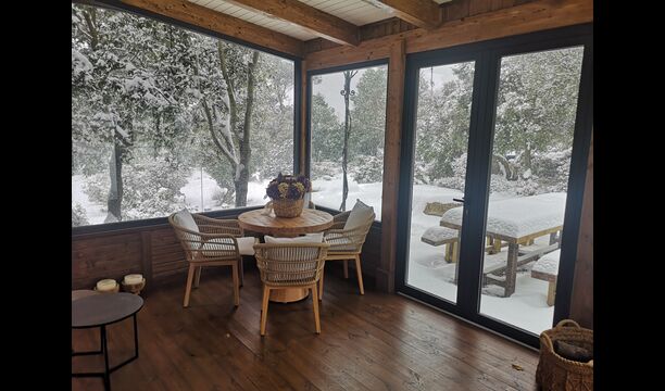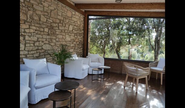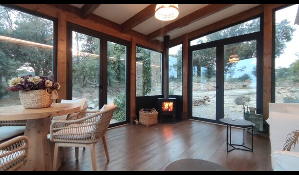De plus, la maison dispose également d'une terrasse couverte et entièrement couverte, avec de grandes fenêtres en verre. Cet espace dispose également d'une petite cuisinière, de canapés et de tables pour se détendre, lire des livres ou jouer aux cartes. Quelle que soit la saison ou la météo, vous prélasser dans cette zone vous procurera forcément un sentiment de paix et de tranquillité, car vous pourrez admirer le grand jardin - et le jardin. et les vues merveilleuses du paysage au-delà.