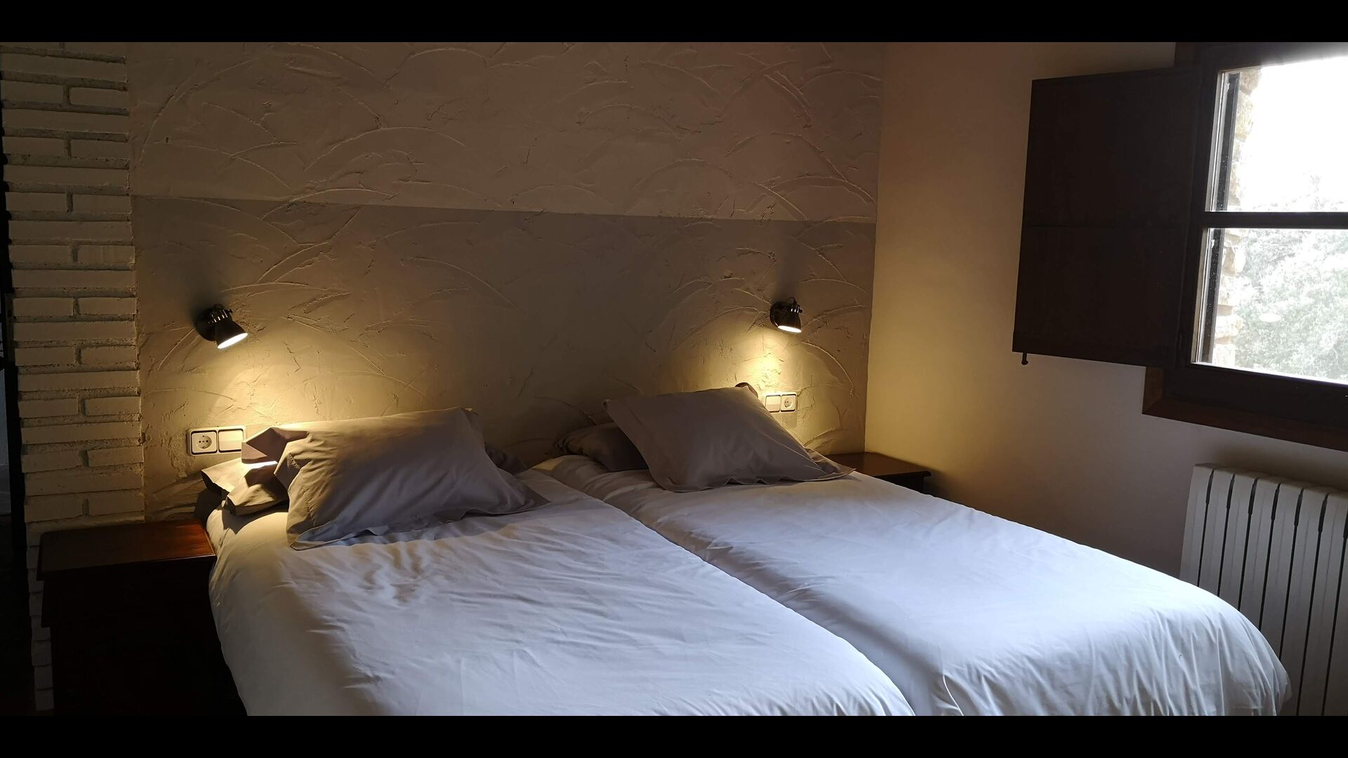 -          Pintell : Une chambre avec 2 lits simples et une salle de bain attenante, dotée d'un coin lecture et vue sur le jardin. Les dimensions d'un lit simple sont 90x190cm.