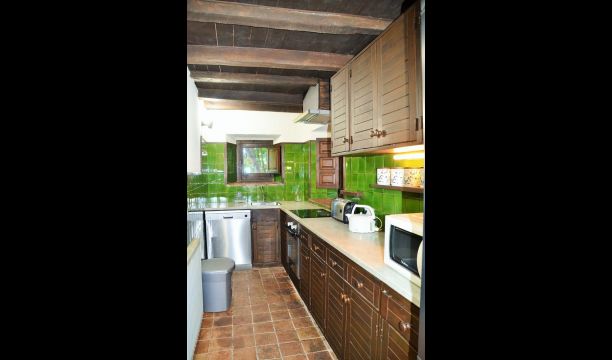 La maison a été complètement réformée et a maintenant un aménagement où vous vous sentez immédiatement à l'aise et chez vous. Du rez-de-chaussée, il y a une sortie sur la piscine d'un côté de la maison et la terrasse avec des sièges pour manger dehors et des parasols devant la pelouse. Pour les plus petits, il y a un bac à sable.