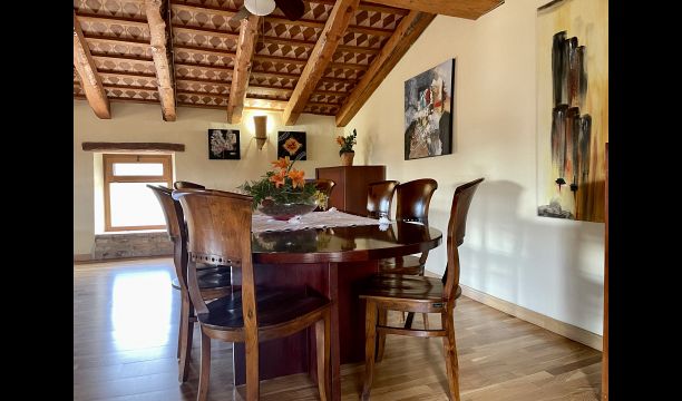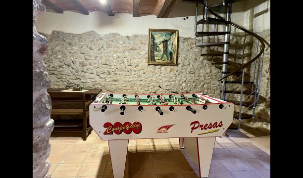 En entrant dans Masia Lagostea, vous arriverez dans une cour brillante avec de petites tables, une zone barbecue et une entrée vers une salle à manger au rez-de-chaussée. De là, vous aurez également accès à la piscine, qui est sécurisée par une porte clôturée, et une autre porte vous mènera au jacuzzi et au sauna. Le rez-de-chaussée dispose d'un excellent espace d'accueil </ strong>avec les produits des champs, que vous pouvez acheter, un grenier restauré, qui a maintenant été transformé en une “grotte” et ici vous trouverez également la salle de jeux avec billard et tennis de table. Dans ce niveau, vous trouvez la chambre adaptée.
